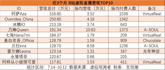 據文創潮統計近三個月的虛擬直播營收情況,注意到,隸屬VirtuaReal的阿薩累積營收超361萬元,排名第一。其中阿薩在8月13日舉行的生日前3D-LIVE直播,營收超80萬,相較于去年同期舉辦的生日會,營收翻了一倍多。場均營收方面較高的A-SOUL,成員乃琳和貝拉近3個月直播場次分別為18場和15場。營收TOP10當中,永雛塔菲的場均最低,與她高頻次直播相關,近90天她直播了184場。