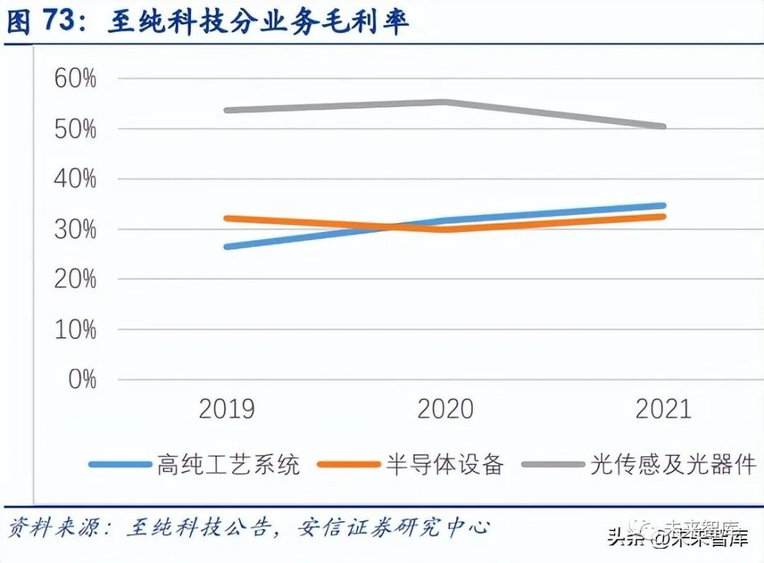 公司的主要業務包括高純工藝系統、半導體設備和光傳感及光器件設備,其中高純工藝系 統占比常年維持高位水平。2021 年營業收入分別為 10.78 億(YoY+24.86%)、7.01 億 (YoY+222.06%)、3.03 億(YoY-3.72%),占公司整體收入比例分別為 51.72%、33.64%、 14.54%。三年來公司整體毛利率呈上升趨勢,分業務來看,2021 年半導體設備毛利率 32.48%,高純工藝系統毛利率 34.71%,同比分別提升 2.94pct、2.63pct。