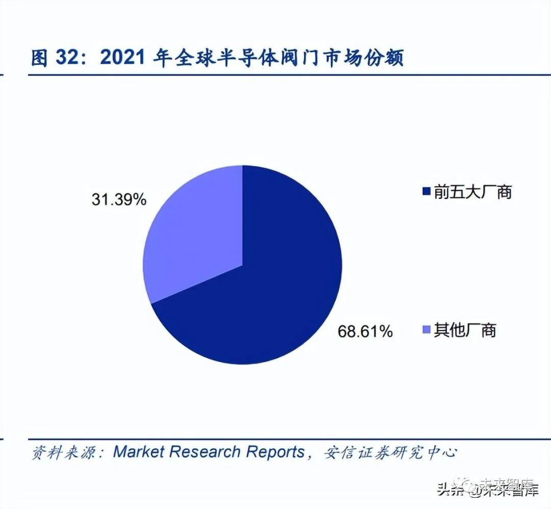 半導體閥門是由帶有輔助設備的半導體器件組成的閥,主要是在流體系統中,用來控制流 體的方向、壓力、流量的裝置。半導體制造是制造用于電子設備和電氣設備的集成電路的 過程,這些過程中需要許多閥門和配件的解決方案。目前,半導體閥門主要可分為隔膜閥、 波紋管閥、真空閥、球閥、蝶閥、門閥、角閥、特氟龍門閥等,其中真空閥是主要的半導 體閥門類型。根據 Market Research Reports 的數據顯示,全球半導體閥門市場預計 2022 年規模將達到 17.12 億美元,預計到 2028 年市場規模達到 25.45 億美元,在 2022-2028 年預測期間的 復合年增長率為 6.8%。半導體閥門全球主要制造商包括 VAT Vakuumventile、Parker、Fujikin、CKD、Swagelok、 MKS、SMC Corporation、GEM、Entegris 等。根據 Market Research Reports 數據顯示, 2021 年全球前五名的收入份額約為 68.61%,市場集中度相對較高。