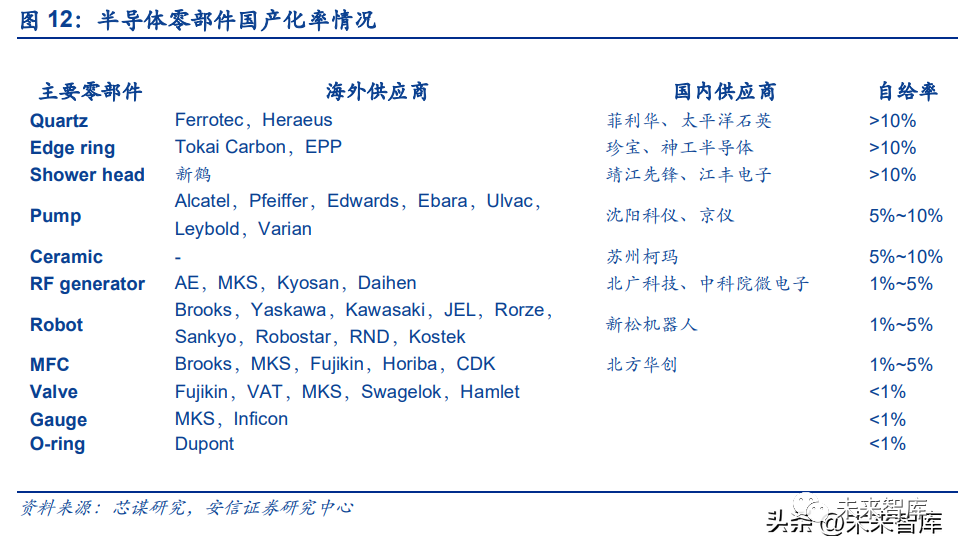 從國產化率來看,目前半導體零部件處于偏低的水平,石英、反應腔噴淋頭、邊緣環等自 給率大于 10%,各種泵、陶瓷部件自給率在 5%-10%之間,射頻發生器、機械手、MFC 等 自給率在 1%-5%之間,閥門、測量儀器等自給率甚至不到 1%。