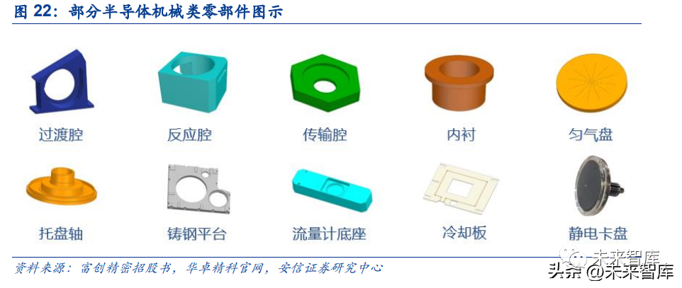 半導體零部件是半導體設備行業的支撐:半導體設備是延續半導體行業“摩爾定律”的瓶 頸和關鍵,而半導體設備廠商絕大部分關鍵核心技術需要物化在精密零部件上,或以精密 零部件作為載體來實現。半導體設備零部件在材料、結構、工藝、品質和精度、可靠性及穩定性等性能方面達到了 半導體設備及技術要求,并具有高精密、高潔凈、超強耐腐蝕能力、耐擊穿電壓等特性, 生產工藝涉及精密機械制造、工程材料、表面處理特種工藝、電子電機整合及工程設計等 多個領域和學科,是半導體設備核心技術的直接保障。