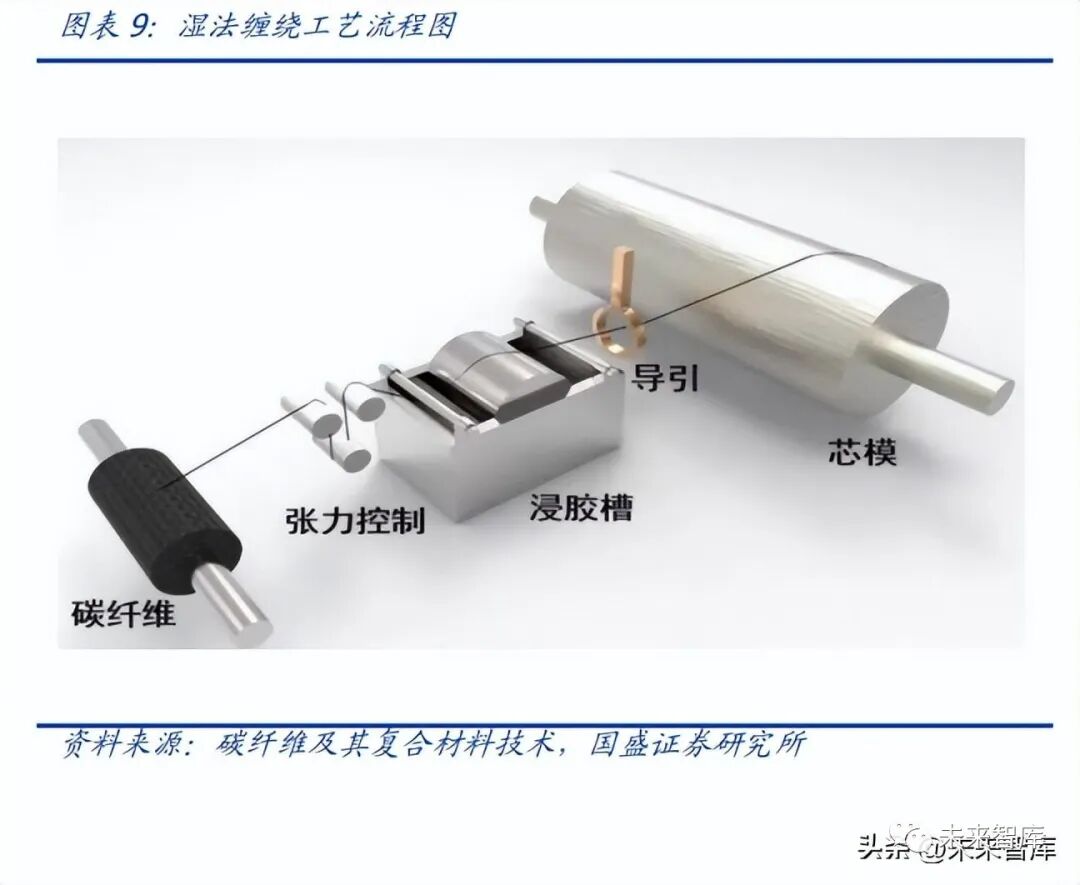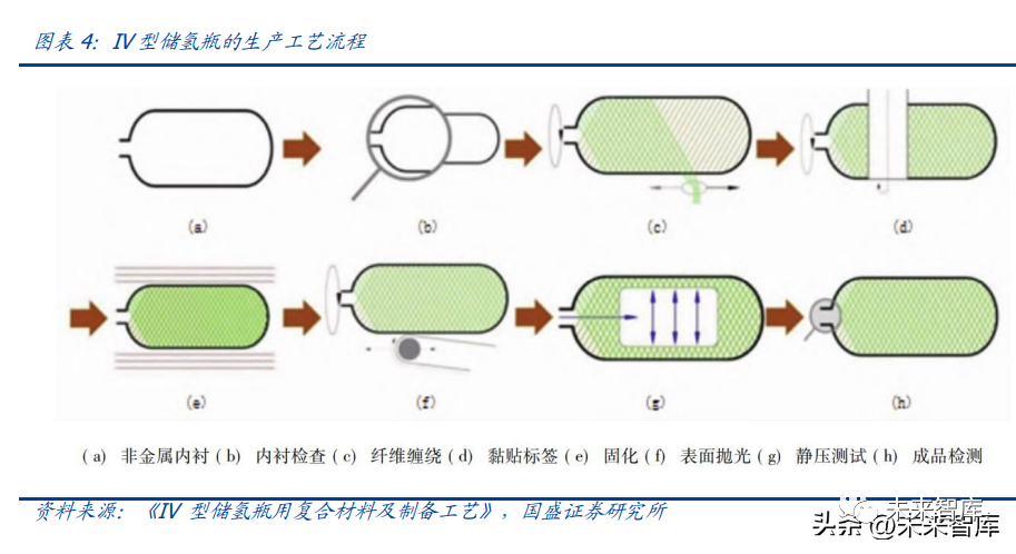 纖維纏繞成型也是儲氫瓶制備的技術難點之一,目前使用的工藝包括濕法纏繞、干法纏 繞和半干法纏繞。1)濕法纏繞是指將碳纖維絲束在特定浸膠裝置中浸漬處理后,再在張力控制下直接纏繞到芯模上。由于纖維離開浸漬裝置后易于將樹脂帶出,后道工序中存 在樹脂滴漏的現象,所以稱為濕法纏繞。濕法纏繞工藝生產成本較低,是目前高壓儲氫 瓶最常用的加工工藝,國內企業基本都采用濕法。但濕法成型下樹脂損耗較高,樹脂與 碳纖維比例難以控制,產品質量及穩定性相對較差。2)干法纏繞是以經過預浸膠處理的 預浸帶為原料,在纏繞機上經加熱軟化至粘流態后纏繞到芯模上。由于預浸帶中纖維和 樹脂含量比例控制較好,產品質量可以精確控制,且樹脂不會隨處滴,整體生產環境整 潔;另外,干法纏繞生產效率高,纏繞設備的速度可以達到 100-200m/min。目前國外正 在逐步向干法纏繞工藝過渡,國內未勢能源等極個別企業也在研究和嘗試干法。此種工 藝的缺點在于成本較高,主要系預浸料及干法纏繞設備購置費用較高。3)干濕法纏繞結 合了干法和濕法的優點,在浸膠碳纖維纏繞到芯模之前通過烘干設備將浸膠碳纖維紗線 中的溶劑除去,提高制品質量。與干法纏繞相比省卻了預浸膠工序和設備,與濕法相比 只是增加了一套烘干設備,卻可以大幅降低制品中的氣泡含量以及孔隙。