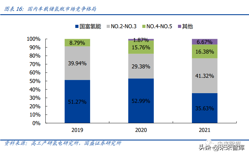 儲氫瓶廠家數量有限,但市場集中度呈下降趨勢。國內儲氫瓶主流廠家數量僅個位數, 但近兩年參與者有所增加,2019 年主要儲氫瓶供應商僅國富氫能、科泰克、天海工業、 中材科技、斯林達 5 家,2020 年新增南通中集,2021 年新增奧揚科技,另外未勢能源 也專門從事氣瓶的生產(偏自產自用)。從出貨量來看,國富氫能 21 年市占率達 35.63%, 位居第一,其次是中材科技;但行業集中度呈持續下降的趨勢,CR3 份額從 19 年的 91.21% 下滑至 21 年的 76.95%,當前氫能產業正處于風口,企業數量不斷增長或將成為常態。