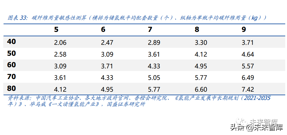 鑒于儲氫瓶及氫燃料電池在非道路車輛以外的場景使用量小且難以準確計量。此處我們 僅對氫燃料電池汽車這一主流應用場景進行碳纖維用量測算,測算方式有自上而下和自 下而上兩種,前者的計算依據為國家層面出臺的政策指引,后者主要是通過加總各地方 政府制定的有關氫燃料汽車的具體發展目標、再進行儲氫瓶及碳纖維用量的估算。