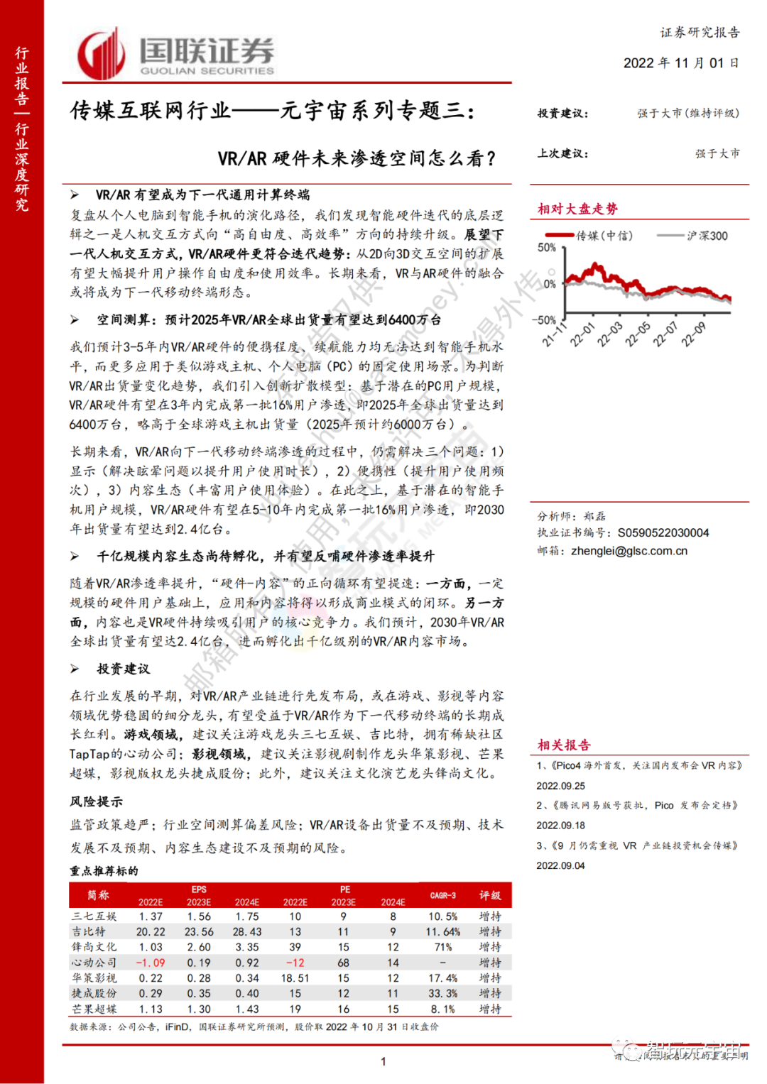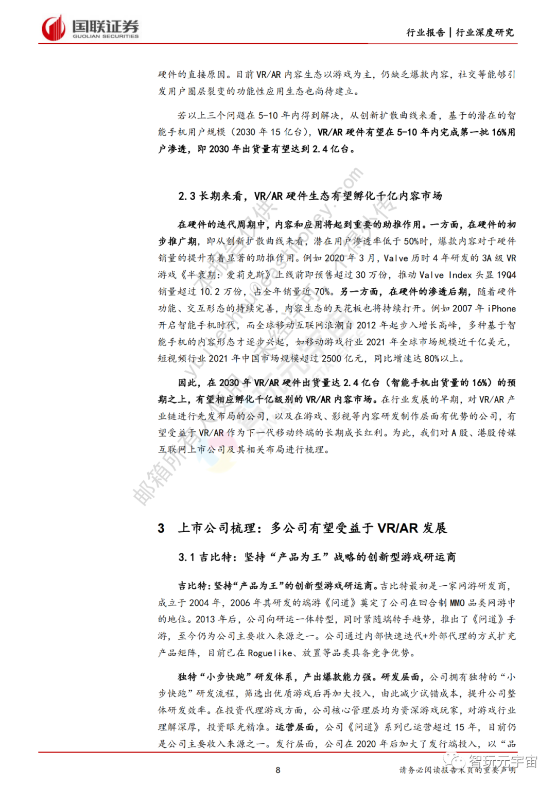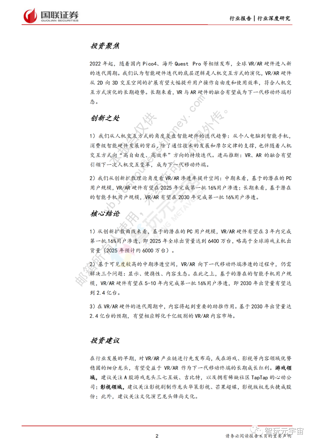 復盤從個人電腦到智能手機的演化路徑,我們發現智能硬件迭代的底層邏輯之一是人機交互方式向“高自由度、高效率”方向的持續升級。展望下一代人機交互方式,VR/AR硬件更符合迭代趨勢:從2D向3D交互空間的擴展有望大幅提升用戶操作自由度和使用效率。長期來看,VR與AR硬件的融合或將成為下一代移動終端形態。 空間測算:預計2025年VR/AR全球出貨量有望達到6400萬臺我們預計3-5年內VR/AR硬件的便攜程度、續航能力均無法達到智能手機水平,而更多應用于類似游戲主機、個人電腦(PC)的固定使用場景。為判斷VR/AR出貨量變化趨勢,我們引入創新擴散模型:基于潛在的PC用戶規模,VR/AR硬件有望在3年內完成第一批16%用戶滲透,即2025年全球出貨量達到6400萬臺,略高于全球游戲主機出貨量(2025年預計約6000萬臺)。長期來看,VR/AR向下一代移動終端滲透的過程中,仍需解決三個問題:1)顯示(解決眩暈問題以提升用戶使用時長),2)便攜性(提升用戶使用頻次),3)內容生態(豐富用戶使用體驗)。在此之上,基于潛在的智能手機用戶規模,VR/AR硬件有望在5-10年內完成第一批16%用戶滲透,即2030年出貨量有望達到2.4億臺。 千億規模內容生態尚待孵化,并有望反哺硬件滲透率提升隨著VR/AR滲透率提升,“硬件-內容”的正向循環有望提速:一方面,一定規模的硬件用戶基礎上,應用和內容將得以形成商業模式的閉環。另一方面,內容也是VR硬件持續吸引用戶的核心競爭力。我們預計,2030年VR/AR全球出貨量有望達2.4億臺,進而孵化出千億級別的VR/AR內容市場。![]()