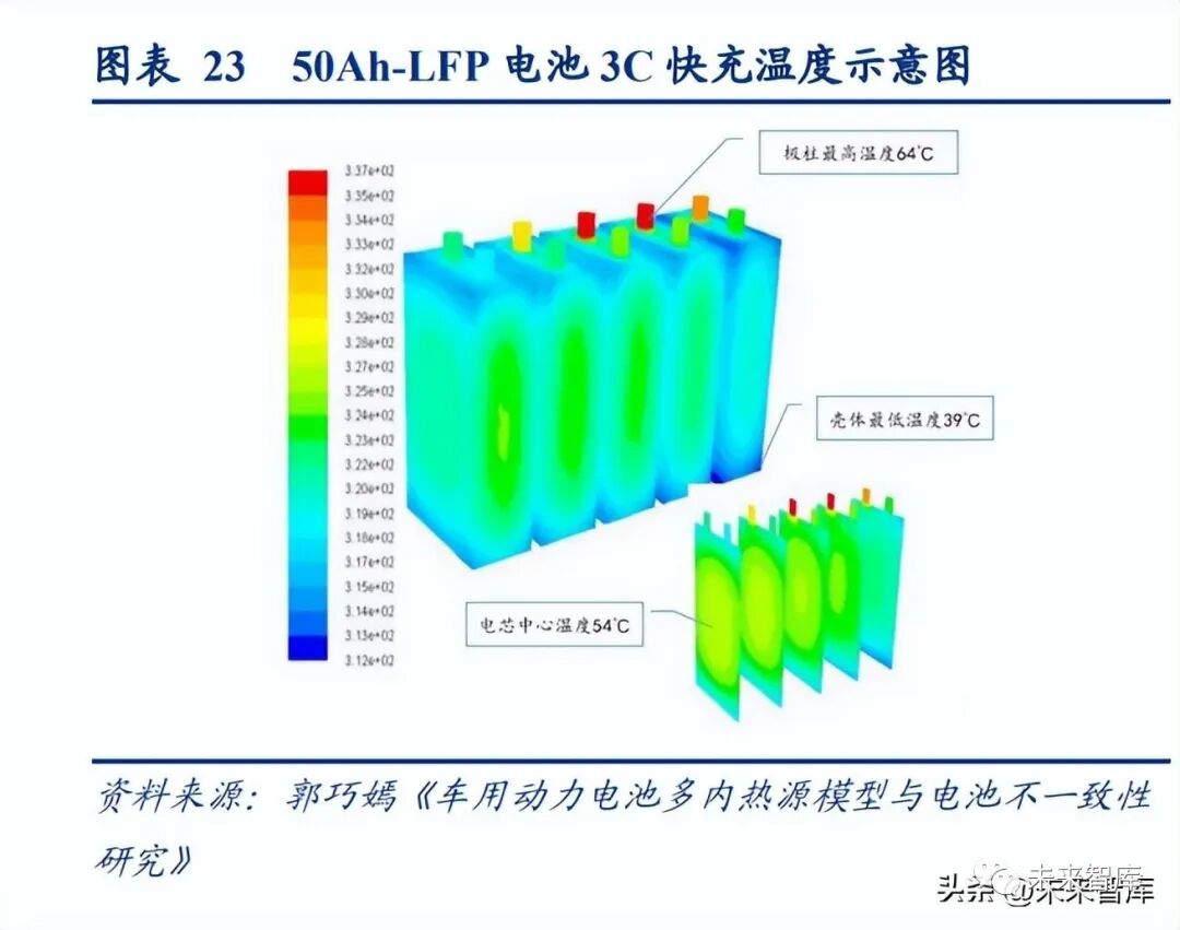 大電流快充電池發熱嚴重,全極耳圓柱電池更適合大電流超充。根據基本定律 Q=I2*R, 500A 充電的發熱量是 100A 充電的 25 倍,如何快速將熱量傳遞出去,是實現大電流快充 的瓶頸。相比于圓柱電池,方形電池具有以下缺點:1)方形電芯散熱路徑長,方形電池 體積和容量遠大于圓柱電池,極柱熱量和內部中心熱量傳遞到水冷板的傳熱路徑遠大于 圓柱電池;2)電芯內部溫差大,進而影響電池一致性、安全性能、電化學性能。50Ah-LFP 方形電芯經過 3C 快充后極柱溫度 64℃,電芯殼體最低溫度 39℃,電芯內部最高溫度 54℃, 最大溫差達到了 25℃,而 18650 圓柱電芯 2C 放電后內部溫差僅 1℃;3)電芯內部曲率 差異較大,方形電池內部存在多個卷繞,卷繞折角處與中心為的曲率半徑不一致,導致 材料界面不一致,不同位置的材料快充能力不一致。