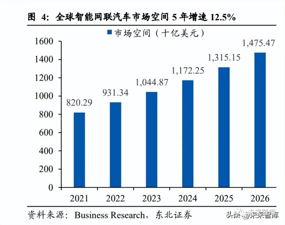 智能網聯汽車相關產業規模快速成長,2026 年中國智能網聯汽車市場規模近 6000 億元。Business Research 預測到 2026 年,包含乘用車、Robo-Taxi、共享汽車、車路 協同等所有相關應用及服務的全球自動駕駛汽車產業鏈市場規模將從 2021 年的 8202.9 億美元增至 14754.7 億美元,年復合增長率 12.5%。前瞻產業研究院預測, 2026 年中國智能網聯汽車產業規模將達到 5859 億元,2016-2026 年年復合增長率達 到 22.15%。