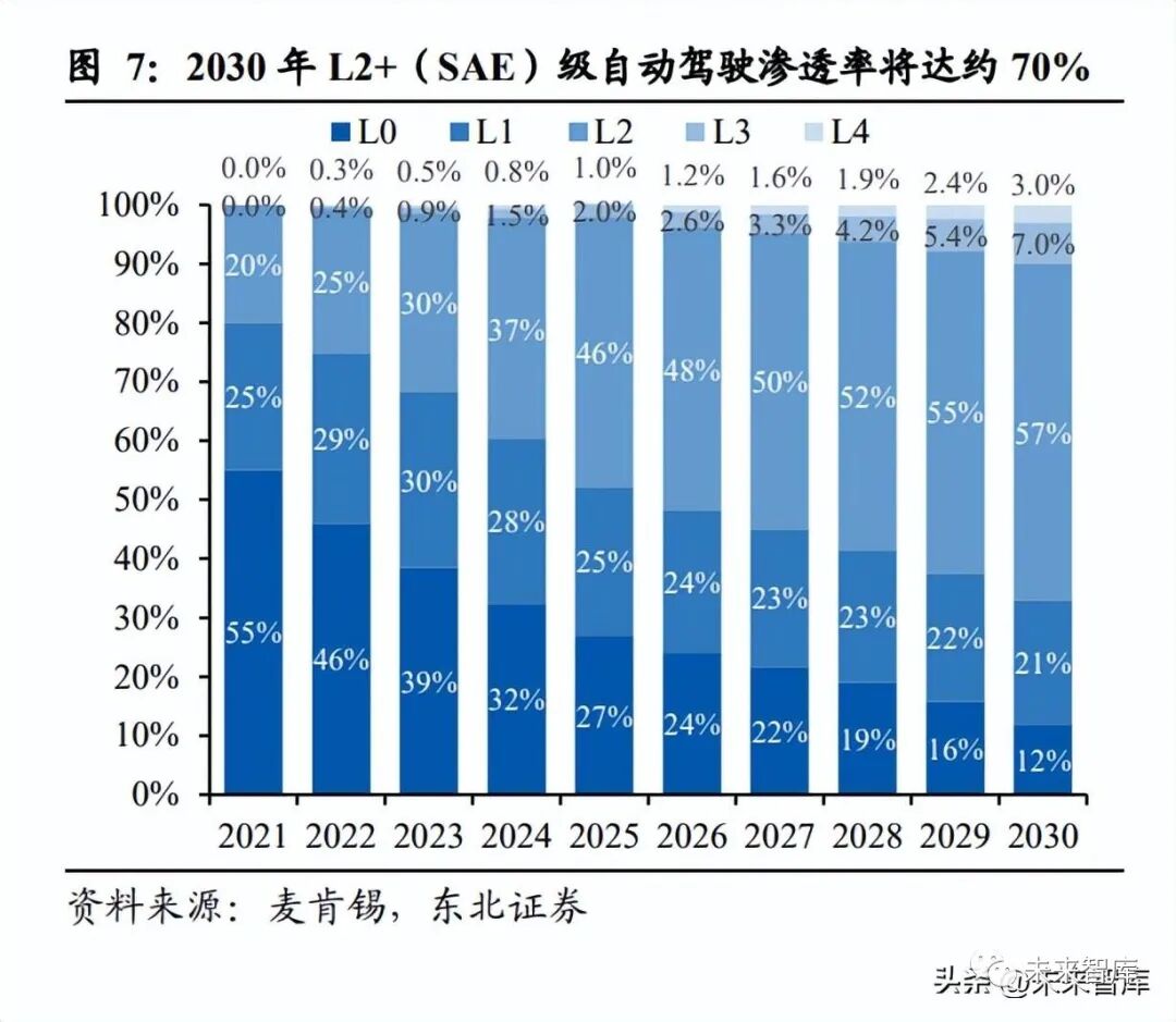 L2 滲透率不斷提升,L3 即將落地。當前各大主機廠的主流智能車型大都已實現 L2 級別的自動駕駛功能,新車 L2 滲透率不斷提升。麥肯錫預測,到 2030 年全球新車 L2 及以上等級的自動駕駛等級滲透率將從 2021 年的 20%提升至 67%,其中 L2 滲 透率 57%,仍將是主流自動駕駛等級。車云數據顯示,我國具備 L2+OTA 功能的智 能網聯乘用車滲透率逐月提升,2022 年 8 月新車銷量(上險數)達 415,208 輛,滲 透率從 2021 年 1 月的 8.0%提升至 21.8%。從分級標準的定義中可以看出 L2 到 L3 的提升是一道門檻。SAE 標準中 L3 車輛將完成大部分駕駛操作,并負責周邊監控 任務;我國標準中 L3 其需要車輛進行目標時間探測與相應等大部分駕駛任務,用 戶在需要時完成動態駕駛任務接管。L3 功能的實現對技術和安全測試的要求大幅提 高,同時引發權責界定等法律問題。依據我國自主廠商的規劃路線圖,目前均處于 L2 向 L3 過渡的 L2.5、L2.9 階段。目前我國 L3 及以上自動駕駛應用以試驗和區域 性示范為主,L4 甚至完全的自動駕駛大規模應用預計短期內難以實現,需要長時間 的技術積累、法規體系的完善及路側基礎設施的建設。2022 年 7 月,深圳市率先立 法支持 L3 上路,明確有駕駛人的智能網聯汽車責任由駕駛人承擔,無駕駛人智能 網聯其策劃責任由車輛所有人和管理人共同承擔。事故權責的明確標明 L3 向正式 落地邁出了堅實的一步。