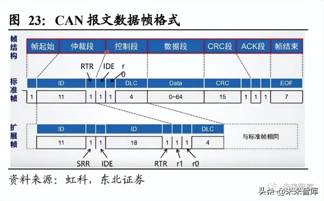 5)CAN FD&CAN XL:2011 年 Bosch 發布了 CAN FD(Flexible Data-rate)的方案 以應對車輛控制器數量和通信數據激增產升的新需求。CAN FD 優化了通信帶寬和 有效數據長度,使得 CAN FD 的通信速率可達到 5Mbps。主要原理為:A. 增加報 文中有效數據占比,將數據域從 8 比特提升至最大 64 比特,使得報文中有效數據 占比顯著提升。B. 增加總線傳輸速率。報文起始時采用 500Kbps,數據區間采用 2Mbps。而 CAN XL 數據段支持最大 2048 字節的數據段,數據段傳輸速度可高達 10Mbps,使得傳輸速率進一步大幅提升。