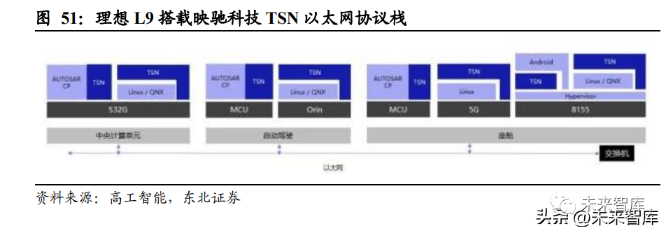 理想 L9 域控架構已搭載 TSN,3.0 架構以太網應用將更加廣泛。TSN(時間敏感網 絡)是車載以太網的一種,理想 L9 采用的域控制器架構中,其中央域控、自動駕駛 域控及座艙域控之間的通信連接均采用 TSN 以太網,保證了高傳輸速度下的低時延 和可靠性。L9 中以太網用于連接中央計算單元(即 XCU)、智駕和座艙三個域控制 器,而 CCU 架構則用于連接四個區域控制器和中央計算平臺,同時區域控制器下 也有可能采用以太網,以太網用量將進一步提升。