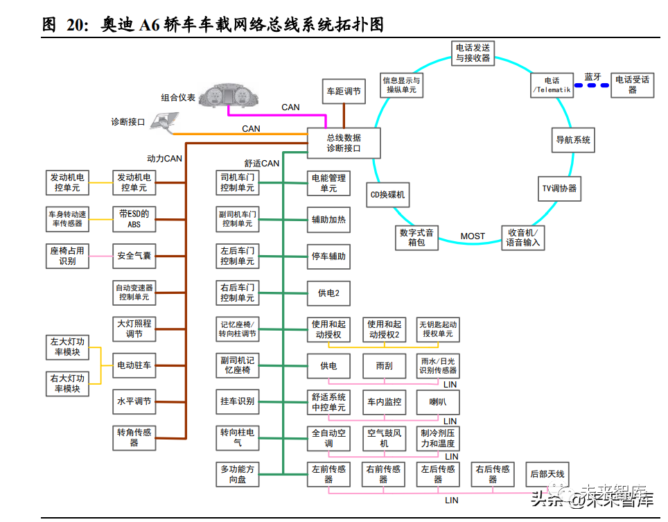 車內不同場景應用不同的總線技術以滿足帶寬與成本的平衡。自總線技術出現以來, 各大汽車廠商及零部件供應商曾開發過種類繁多的通信協議。SAE 依據傳輸速度和 用途將汽車網絡劃分為四個等級,一個典型的車內網絡會同時應用多種總線技術以 針對功能、安全需求不同的場景,保證可靠性的同時做到成本控制。以奧迪 A6 的 車內網絡架構為例,其發動機及動力相關功能接到動力 CAN 總線上、車門、座椅等 功能連到舒適 CAN 總線上,音視頻單元則使用 MOST 總線進行連接,各類型總線 之間通過總線數據診斷接口/網關進行連接。