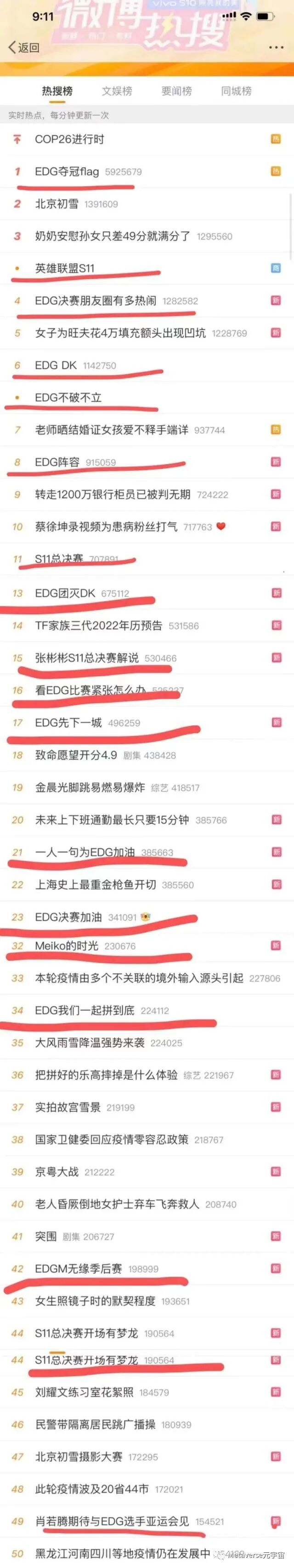 北京時間11月7日凌晨,英雄聯盟S11總決賽正式開打,在對手2-1拿下賽點的情況下,EDG戰隊總比分3-2強勢逆轉,獲得2021年英雄聯盟全球總決賽冠軍。EDG奪得S11冠軍的多條相關消息更是獨霸熱搜。