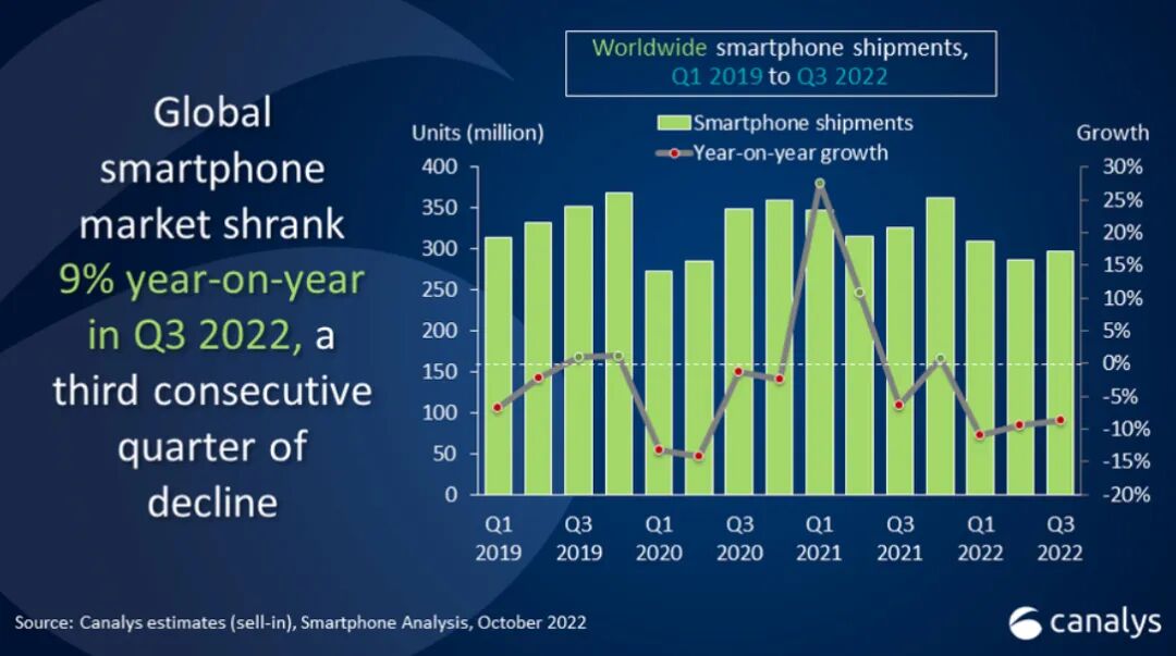 Canalys的最新報告顯示,幾年三季度全球智能手機出后量同比下跌9%,是2014年以來最糟糕的同期表現。在市場份額排名前五的廠商中,只有蘋果的出貨量實現正增長,份額也提升到18%,和榜首的三星差距進一步縮小。