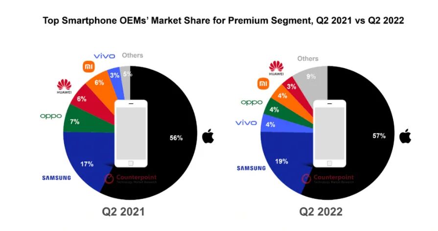 但這些品牌在高端市場的表現,可謂喜憂參半。同樣來自Counterpoint的數據顯示,今年二季度蘋果占據全球高端智能手機市場57%的份額,較去年同期增長1個百分點。三星排名次席,市場份額為19%,同比增長2%。然而,排名三至五名的vivo、OPPO、小米份額均為4%左右,且除了vivo外都較去年出現下滑。