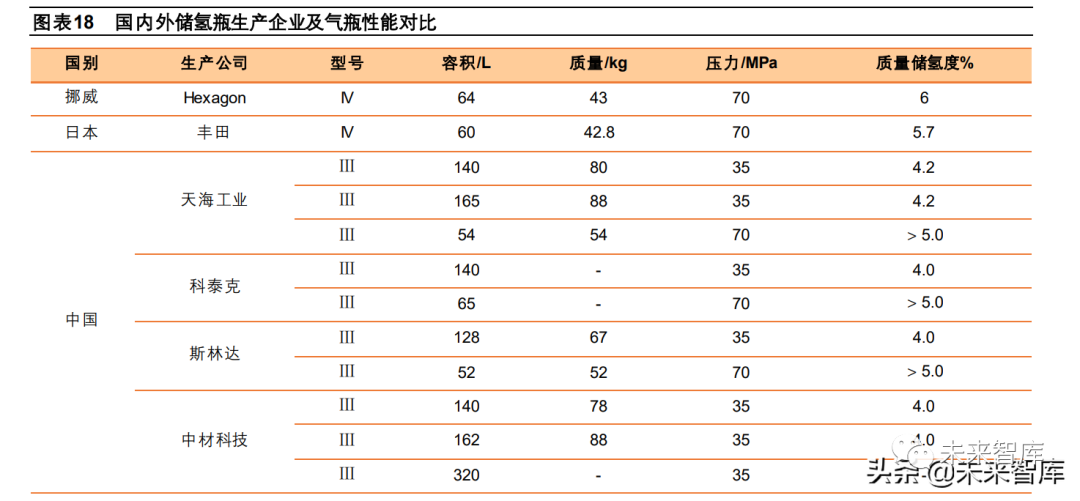 從國內主要高壓儲氫瓶生產企業生產的 III型儲氫瓶與國外 IV型瓶性能對比來看,IV型瓶質量輕且儲氫密度高。同等體積下, 壓力越大儲氫量越高,車輛行駛里程就更遠。根據《汽車產業中長期發展規劃》,短期內國內儲氫技術仍然會以高壓儲氫為 主。