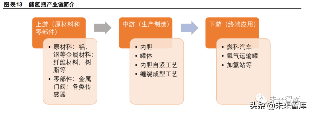 車載儲氫氣瓶:在高壓儲氫技術中,目前最為成熟且成本較低的技術是鋼制氫瓶和鋼制壓力容器,但是鋼制氫氣瓶由于較高 的重量,不適宜汽車用,因此車用高壓儲氫瓶的國際主流技術通過以鋁合金/塑料作為內膽,外層則用碳纖維進行包覆(即 所謂的 III 型、IV 型瓶),提升氫瓶的結構強度并盡可能減輕整體質量。國內車載儲氫氣瓶的企業較多,特別是 III 型。隨著 氫燃料電池車的發展,車載儲氫瓶的需求量是相對最大的領域,但是競爭也較為激烈,技術領先、儲氫成本較低的公司將受 益。