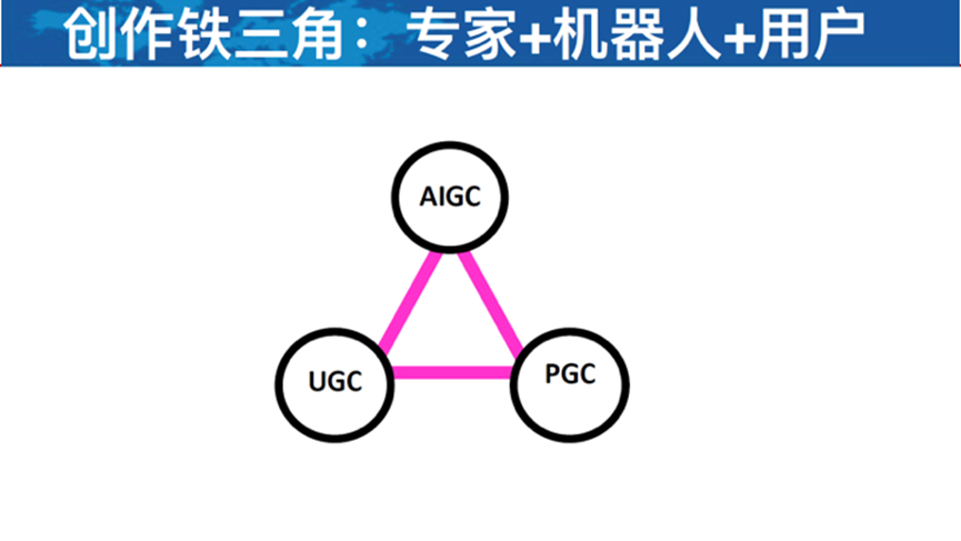 在元宇宙的世界中,形成了一個創作鐵三角,當人工智能的算法(AIGC)、PGC(專家)、UGC(用戶)一起創作的時候,這個世界將會發生天翻地覆的變化。傳統的創作大多都是專家創作PGC模式,今天在元宇宙的世界,大量素人、產品工坊、普通消費者,也開始進入創作UGC的模式將越來越得到尊重。同時也可以看到,今天的AIGC,依靠人工智能算法數字機器人也在開始創造大量的作品。