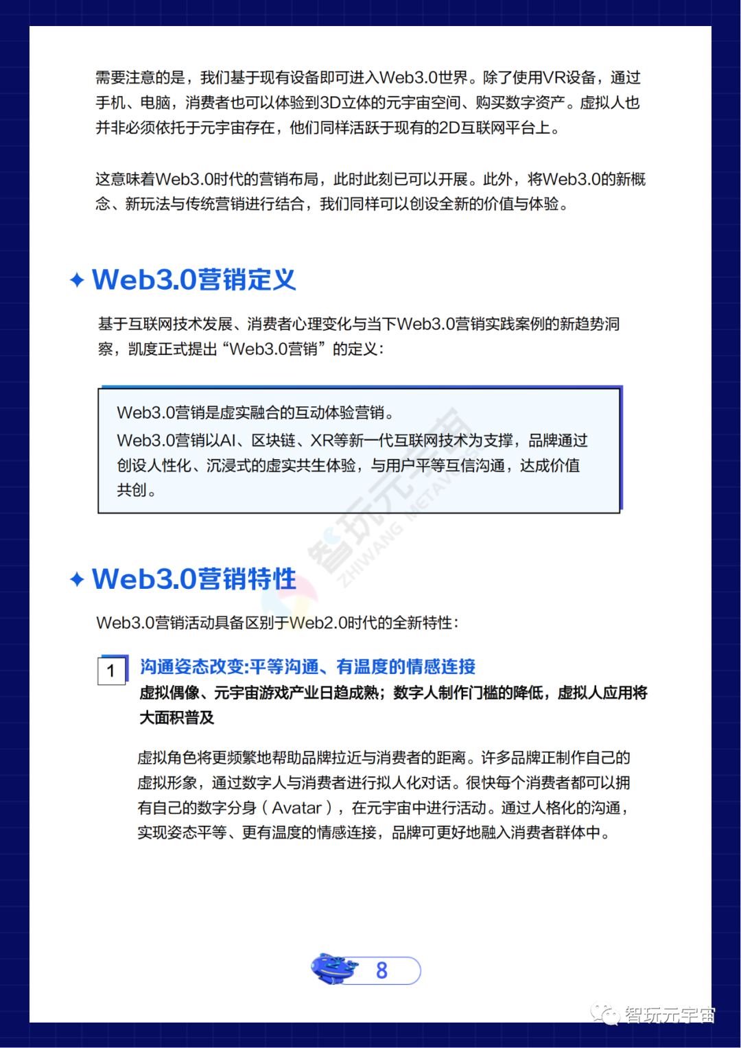 Web3.0是對最新一代互聯網發展形態的指代。理解Web3.0,即是在理解現已開啟的新一代互聯網世界長什么樣,理解我們未來的世界經濟、文化和社會治理等方方面面的運行規則變革,將對營銷法則產生什么樣的影響。以數字人、元宇宙、數字藏品為代表的“Web3.0式數字生活新元素”正在以越來越快的速度深度介入大眾消費世界,互聯網流量紅利日趨消失,營銷界亟待尋求創新突破營銷思路。在這樣的背景下,凱度與百度營銷正式推出行業首份《Web3.0營銷白皮書》。報告提出了Web3.0營銷的定義,梳理了Web3.0營銷區別于傳統營銷的新特征、價值和展望方向。報告基于百度營銷大數據洞察,通過訪談具有Web3.0營銷經驗的頭部廣告主、知名媒介創意機構、領先的 Web3.0制作運營團隊,并綜合對數字營銷行業人士、普通消費者的定量調研,總結了《Web3.0營銷PRE-SCIENCE效能法則》,以期幫助營銷人制勝Web3.0營銷時代。過去一年,你是否越來越頻繁地聽到身邊人提及有關“Web3.0、數字人、元宇宙、NFT、數字藏品”的話題?百度觀星盤數據顯示,2021年7月至2022年7月一年間,“數字藏品”相關搜索熱度月均復合增長率124%,約相當于每月翻一番多。同期,“元宇宙”關鍵詞搜索熱度同比增長273%, 而“數字人”關鍵詞搜索熱度同比增長也超過了400%。根據凱度對一二線城市的500位18-45歲消費者及100位互聯網廣告主的隨機問卷調研顯示,65%的受訪廣告主和72%的消費者認為,過去一年身邊圈層提及Web3.0相關話題人數和頻率有所增加。![]()