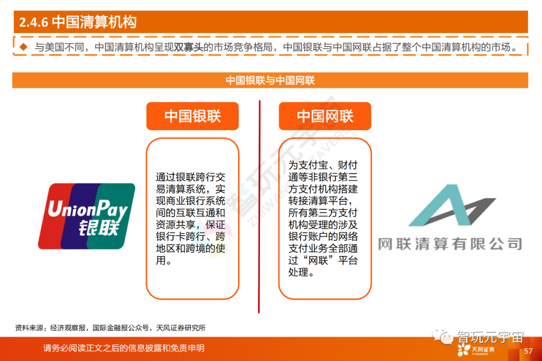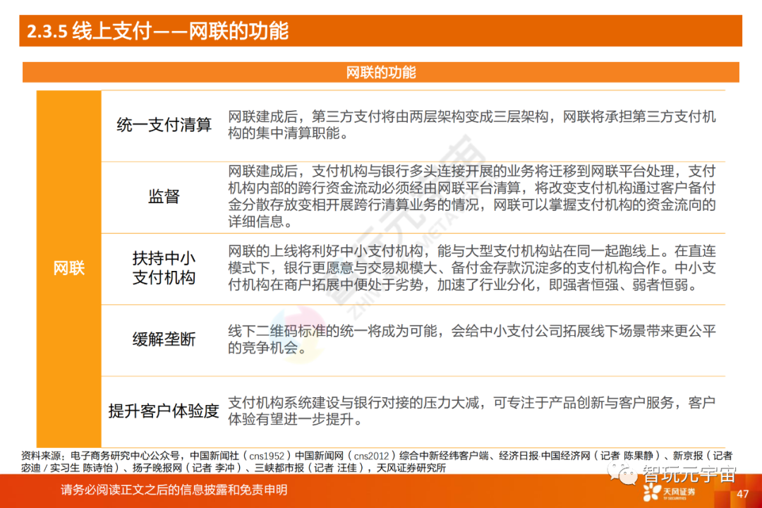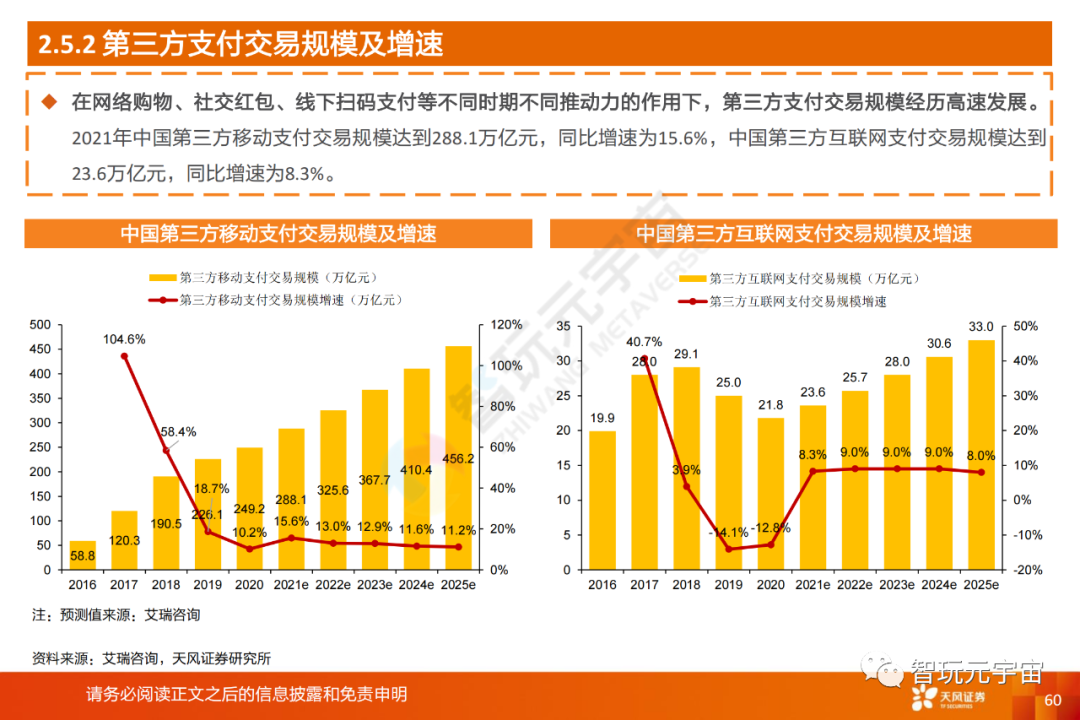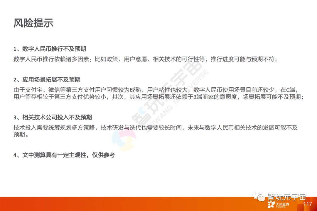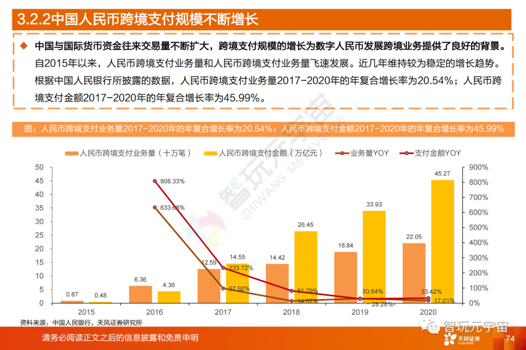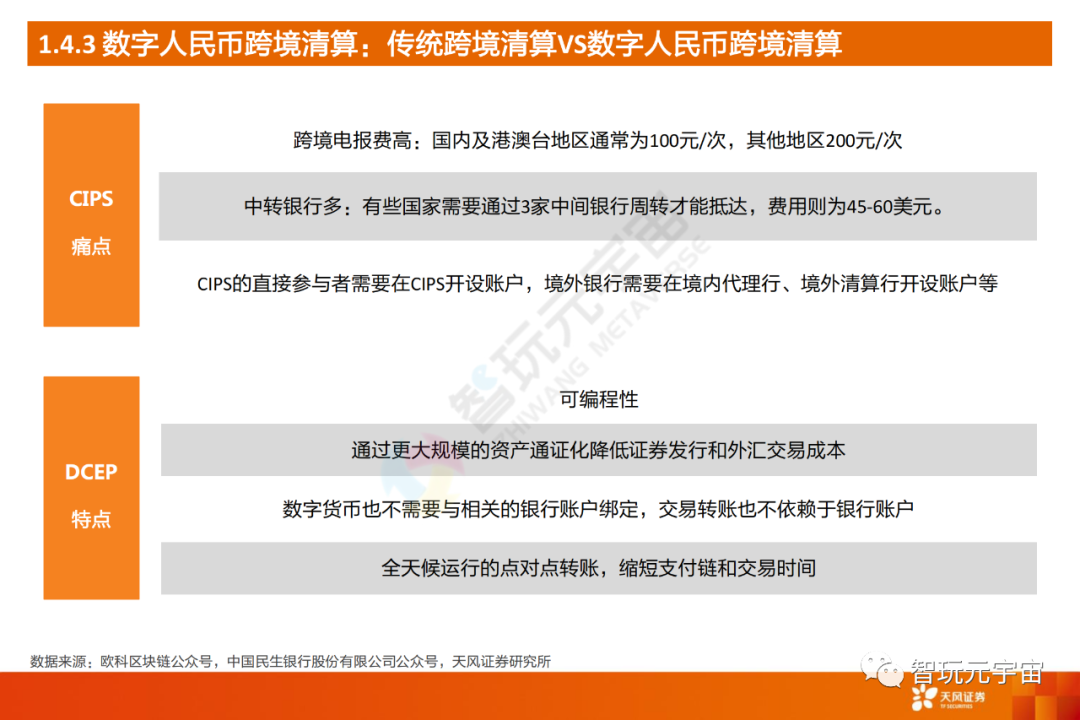 2017年以來,數字人民幣研發試點穩妥推進,基本涵蓋了長三角、珠三角、京津冀、中部、西部、東北、西北等不同地區。已在批發零售、餐飲文旅、政務繳費等領域形成一批涵蓋線上線下、可復制可推廣的應用模式,試點地區的用戶、商戶、交易規模穩步增長,市場反響良好。2、支付產業鏈演進:參與者眾多,四方清算體系逐漸形成,利潤分配模式清晰 支付產業鏈的發展經歷“兩方模式”、“三方模式”之后,形成了清算機構、發卡機構、收單機構、消費者各司其職的四方清算體系。 96費改后,中國四方清算產業鏈利潤分配清晰——按照商家手續費7:2:1分配給發卡方、收單方和清算機構。3、數字人民幣跨境清算業務市場規模廣闊,有望解決跨境支付痛點數字人民幣在國際清算環節可跨過SWIFT系統,大幅降低跨境轉賬成本和政治風險。人民幣跨境支付業務量2017-2020年的年復合增長率為20.54%,人民幣跨境支付金額2017-2020年的年復合增長率為45.99%,中國人民幣跨境支付規模不斷增長,數字人民幣跨境業務發展前景廣闊。4、 數字人民幣對第三方支付影響的探討:機遇與挑戰并存 從本質上來講,數字人民幣與第三方支付屬于支付鏈條上不同階段的角色:前者是“錢”,是數字形式的法定貨幣;后者是“錢包”,是貨幣的支付運行設施和體系、方式,是為貨幣的流通服務的。 挑戰:第三方支付壟斷格局可能被打破。目前中國第三方支付市場由支付寶與微信(財付通)壟斷,市場呈現寡頭格局。數字人民幣在零售支付場景的使用過程中,支付終端和支付體驗與現有的第三方支付存在諸多重合,可能對第三方支付平臺造成流量擠壓。數字人民幣APP與商業銀行APP或將成為未來支付新參與者。 機遇:C端-收單機構在C端有望通過相關場景創新,提供豐富場景下的解決方案,催生新的盈利點。B端-具備央行數字貨幣分發職能的第三方支付機構可以圍繞數字人民幣提供“支付+”的全鏈式、多元化服務。數字人民幣產業鏈上游主要包括芯片和基礎技術,產品差異化較大,競爭較為分散。中游主要涉及銀行IT行業,軟件建設需求持續釋放,盈利空間大,2020年軟件市場規模達215.9億元,同比增長21.4%,2025年中國銀行IT解決方案市場規模或將達到1186億元。下游主要包括軟硬件錢包、數字錢包、終端機具新建及改造業務、第三方支付機構,業務覆蓋場景多。![]()