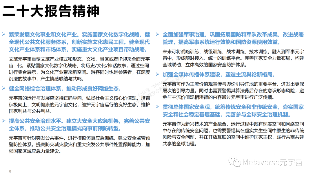 報告總體上沿著“由當下到未來、由虛擬到現實、由中國到世界”的思想脈絡進行梳理,試圖全面總結元宇宙的發展脈絡與規律,促進元宇宙相關技術升級,分析產業如何進行虛實融合,從而按照自身發展邏輯,通過新興科技實現中國式現代化。