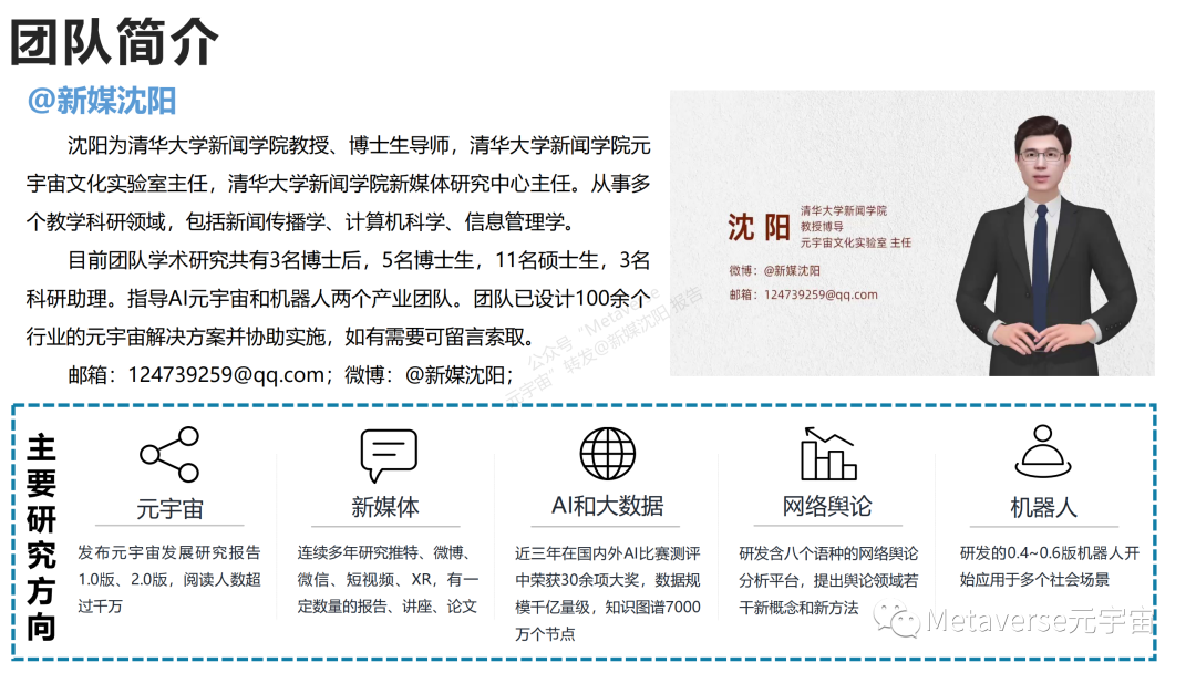 沈陽為清華大學新聞學院教授、博士生導師,清華大學新聞學院元 宇宙文化實驗室主任,清華大學新聞學院新媒體研究中心主任。從事多個教學科研領域,包括新聞傳播學、計算機科學、信息管理學。目前團隊學術研究共有3名博士后,5名博士生,11名碩士生,3名 科研助理。指導AI元宇宙和機器人兩個產業團隊。團隊已設計100余個行業的元宇宙解決方案并協助實施。