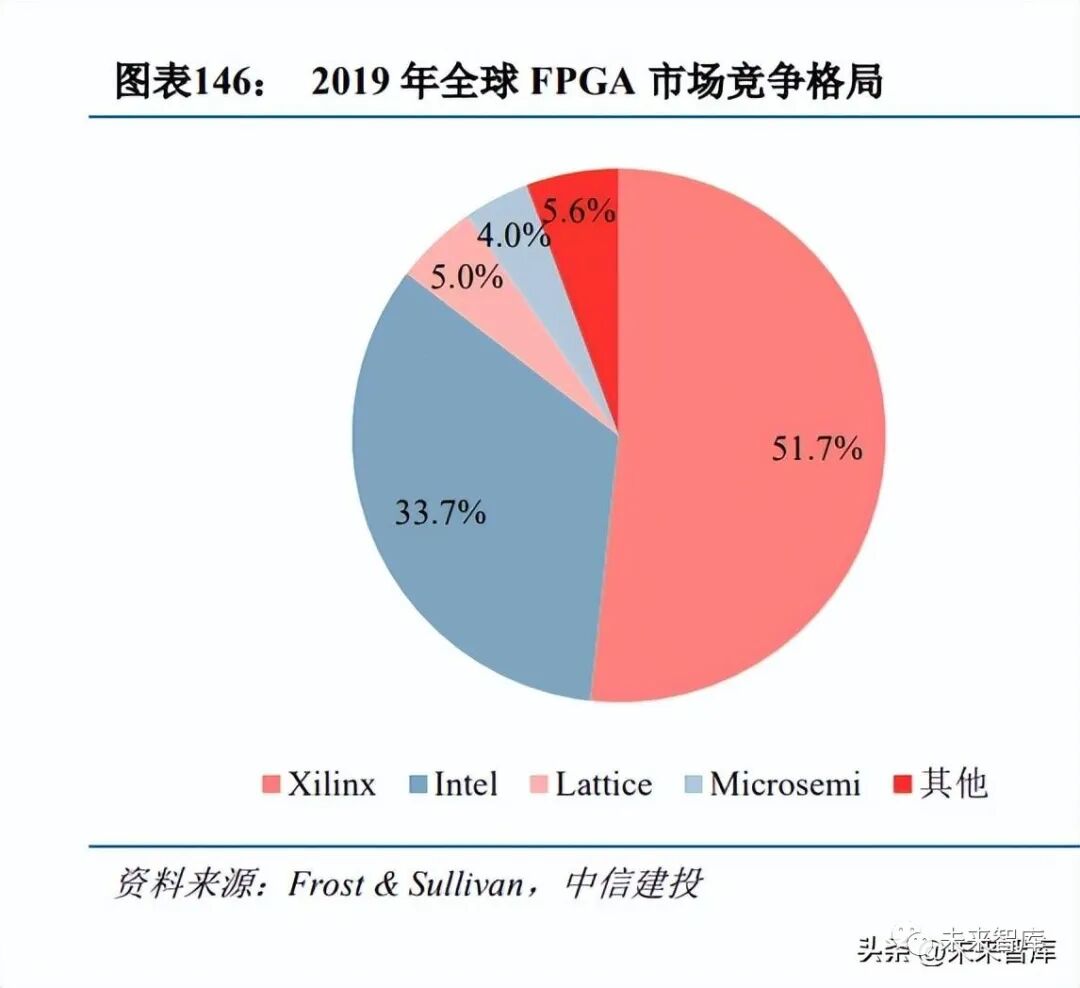 全球 FPGA 主要被海外廠商主導,國內自給率低。全球的 FPGA 主要供應商包括賽靈思、Intel(Altera)、 Microsemi 和 Lattice 等國際芯片設計公司,合計市場份額較高。根據 Frost & Sullivan,以出貨量統計,2019 年 全球市場上,賽靈思、Intel(Altera)、Lattice 和 Microsemi 的市占率分別達 51.7%、33.7%、5.0%和 4.0%。中 國市場上,賽靈思、Intel(Altera)和 Lattice 分別占據了 36.6%、25.3%和 23.2%的市場份額。目前國內主要的 FPGA 廠商有紫光同創、復旦微電、安路科技、高云半導體和京微齊力等,其中安路科技和紫光同創產品結構 偏向消費電子、工業控制和通訊等,復旦微電產品結構偏向特種應用,三者屬于國內 FPGA 第一梯隊。