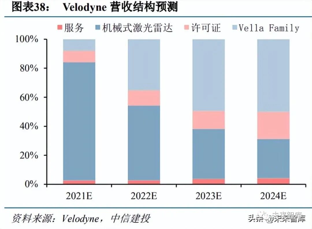 軟硬件系統整合將成為激光雷達廠商技術核心競爭力。隨著未來技術路線定型,激光雷達硬件會逐步趨向 標準化,能提供軟硬件結合的系統解決方案的激光雷達能滿足客戶多元化需求,有望在市場中占據主動。目前 Velodyne 基于其 Velarray 傳感器開發 ADAS 解決方案 Vella Famliy,并預計在 2024 年 Vella Family 將成為占比最 高的營收來源,且軟件部分占公司總營收比例超過 20%;Luminar 提供專有軟件解鎖其激光雷達全部功能,并 可通過 OTA 進行升級,預計 2025 年軟件營收超過 4 成;速騰聚創推出專為自動駕駛環境感知開發的 AI 軟件 RS-LiDAR-Perception 以及面向自動駕駛、無人物流等多項場景的激光雷達解決方案。