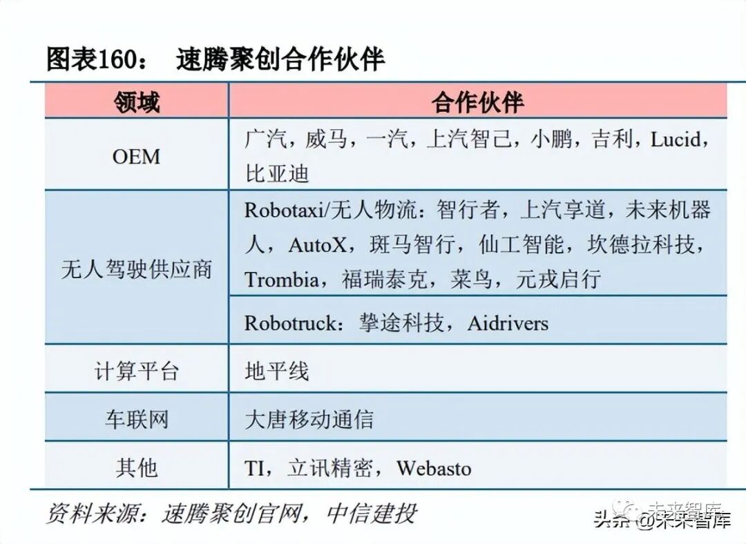 速騰聚創(RoboSense)2014 年成立于深圳,是全球領先的智能激光雷達系統科技企業。速騰聚創通過激 光雷達硬件、感知軟件與芯片三大核心技術閉環,為市場提供具有信息理解能力的智能激光雷達系統,顛覆傳 統激光雷達硬件純信息收集的定義。截止 2020 年,公司全球布局激光雷達相關專利超過 600 項。合作伙伴覆蓋 全球各大自動駕駛科技公司、車企、一級供應商等,產品技術已廣泛應用于自動/輔助駕駛乘用車&商業車,無人物流車,機器人,RoboTaxi,RoboTruck,RoboBus, 智慧交通新基建等細分領域,其中前裝定點量產項目覆 蓋超跑、轎跑、SUV、重卡等各類車型。