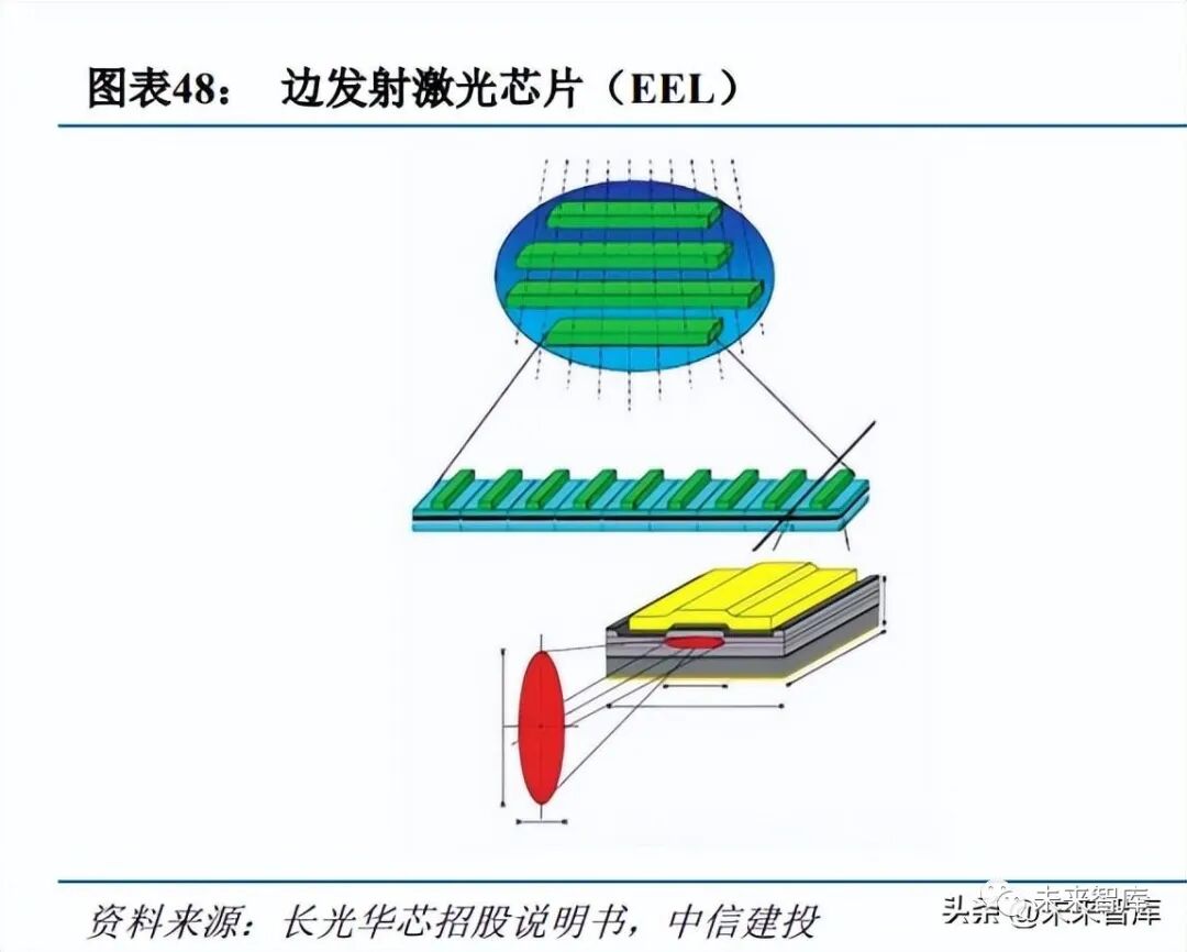 泵浦源為光纖激光器核心零部件,成本占比高達 50%。光纖激光器的核心器件包括泵浦源、諧振腔、增益 光纖,其他器件包括隔離器、合束器、耦合器、波分復用器等。半導體激光芯片(例如 EEL)可封裝為泵浦源。根據長光華芯招股說明書,泵浦源是激光器的核心器件之一,占光纖激光器成本比例高達 50%。泵浦源內部是 將多顆半導體激光芯片的光線進行合束,激光芯片占泵浦源成本的 10%。