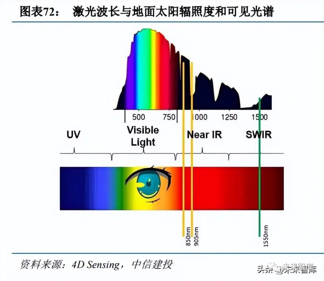 背景輻射分布與供應鏈決定了當前以 905nm 和 1550nm 為主的競爭格局。激光雷達系統的目標之一是發射 不會干擾其他傳感器(照相機、人眼)的光線。因此,激光雷達的波長主要位于電磁波譜的近紅外部分(750nm 至 1.5μm)。目前主流方案集中于 905nm 和 1550nm 這兩個特定波長,其主要原因是:1)背景輻射分布:太陽光在經過地球大氣體系吸收后,到達地面的光譜強度分布并不均勻,即各個波長的 背景輻射存在差異。905nm 和 1550nm 均處于低背景輻射段,采用這兩種波長可以降低背景輻射的干擾。2)相關產業鏈成熟度:手機、平板等消費電子產品上的激光雷達陣列主要采取 940nm 激光,產業鏈發展 成熟,905nm 與 940nm 波段接近,都使用 GaAs 襯底,可以享受同樣成熟的產業資源,而且 905nm 的背景輻射 強度比 940nm 更弱。1550nm 則是玻璃光纖的最低損耗窗口,在光纖通信中得到廣泛應用。