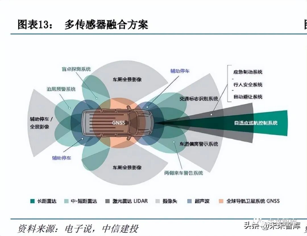 多傳感器融合為自動駕駛感知方案主流選擇。雖然 Tesla 邁向純視覺方案,但從安全性角度,基于攝 像頭的視覺方案在暗光、環境大光比以及雨水遮擋的情況下容易失效,難以用算法解決,同時深度學習算 法難以避免長尾效應。從商業的角度,大多數主機廠缺乏 Tesla 的數據和算法積累,跟隨 Tesla 方案難以在 同一時期達到相同水平。目前絕大多數廠商均使用多傳感器融合技術(包括主打視覺方案的 Mobileye 也開 始自研激光雷達),即通過不同種類的傳感器遍布車身,實現 360 度無死角和遠中近掃描,獲取海量數據, 融合分析后形成駕駛決策輔助駕駛員或控制汽車。各傳感器應對不同場景,實現優勢互補。