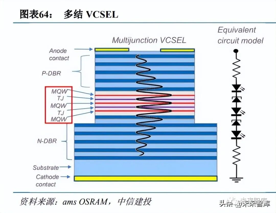 隨著汽車激光雷達的市場需求增長,多結 VCSEL 陣列成為全球領先廠商的重點布局產品。相比單結 VCSEL, 多結 VCSEL 可以:①提升能量轉換效率(PCE),降低功耗;②提供更高的功率密度,對光學系統設計更加友 好;③提高效率,對激光驅動器更加友好;④提供更高的峰值功率,擴大測距工作范圍;⑤降低激光器的“每 瓦成本(Cost per Watt)”。2020~2021 年,全球主要廠商陸續發布了雙結和三結 VCSEL 產品,Lumentum 則在 2021 年 3 月首發五結和六結 VCSEL 陣列,每個發射孔的光功率超過 2W,從而使得 1 平方毫米 VCSEL 陣列的 峰值功率超過 800W。
