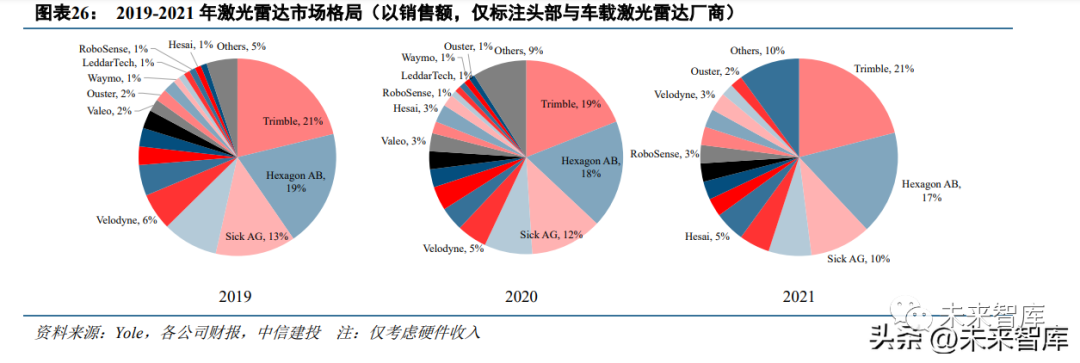 禾賽、速騰營收規模持續提升,2021 年市占率上升至車載市場前兩名。根據 Yole 數據,在全球 21.52 億美 元的激光雷達市場(2021 年)中,現有主要參與者仍是來自測繪(Trimble, Hexagon AB)與工業(Sick AG)領 域的供應商,CR3 達到 48%。但在車載激光雷達廠商中,中國廠商禾賽科技、速騰聚創市占率持續上升,其中 禾賽科技市場份額達到 5%,成為車載領域第一;速騰聚創市場份額 3%,位列車載領域第二。曾占據市場先機 的海外廠商 Velodyne 份額逐年下降,Waymo 也因 2021Q3 起停止對外銷售自研激光雷達而跌出前 15。其他美股 激光雷達公司 Luminar、Innoviz、Aeva 和 Cepton 2021 年的合計市占率僅為 2.6%。