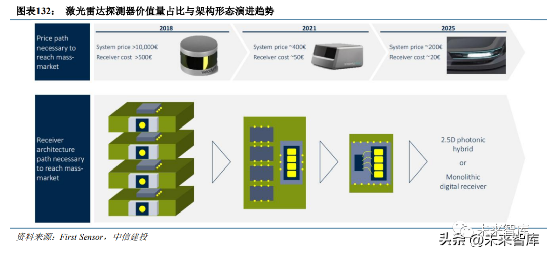 激光接收端技術難度大,芯片集成化的趨勢也將使探測器和信號處理電路的重要性日益凸顯。同時,隨著 未來固態式激光雷達技術成熟,將去除與掃描技術路線耦合較深的 MEMS 振鏡、轉鏡等,光電探測器與信號處 理電路的價值量將進一步上升。