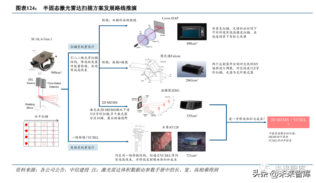 以 SCALA Gen.1 為初代機,當下典型的半固態激光雷達可視作兩種不同改進思路所產生的結果。統一分 析法雷奧 SCALA Gen.1、Livox HAP、圖達通 Falcon、速騰聚創和禾賽 AT128,若視法雷奧 SCALA Gen.1 為初 代機,其他激光雷達為不同的改進方案,則可以劃分出兩類演進路線:掃描系統重設計和發射系統重設計。1)掃描系統重設計:如 4.2 節所述,越復雜的轉鏡/棱鏡設計,對應越強大的光束操縱功能。掃描系統復雜 度的提升帶來激光收發的復雜度降低,最終實現性能提升——利用較少的激光收發模組實現高線束掃描,同時 盡可能地降低成本和體積。例如采用雙楔形棱鏡的 Livox HAP 在性能提升的同時,體積相比 SCALA Gen.1 有所 下降(圖達通 Falcon 體積增加主要源于引入了光纖激光器以追求更好的測距性能)。而速騰聚創 M1 通過 MEMS 振鏡替代多個轉鏡/棱鏡實現二維掃描,整機體積進一步縮小。2)發射系統重設計:禾賽 AT128 掃描端維持一維轉鏡方案,但發射端改為 VCSEL 陣列,高度集成化的 VCSEL 相比分立激光源以更小的體積和成本實現了高線束掃描。然而,一維轉鏡將固定占據一部分空間,這將 會限制整機體積的進一步微縮。