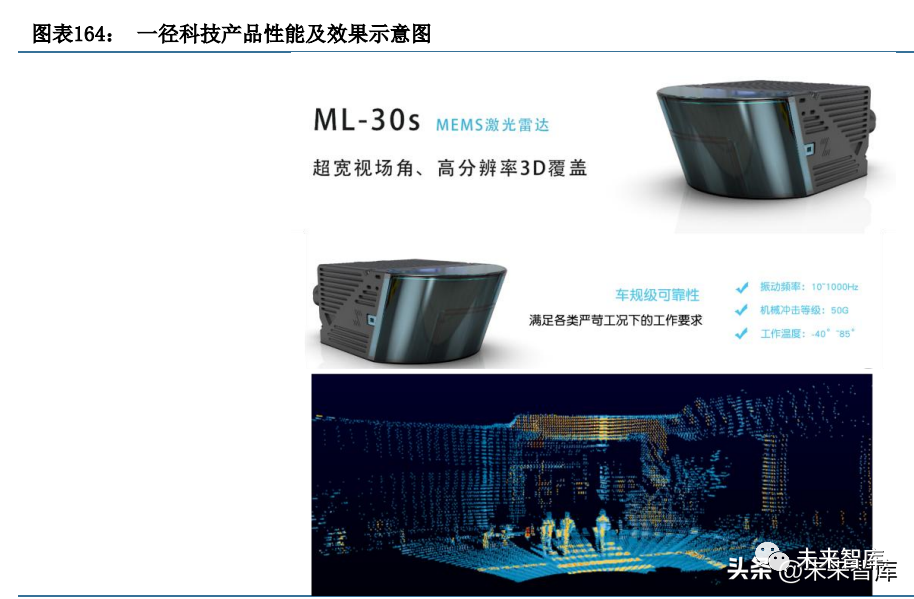 聚焦面向前裝量產的 MEMS 半固態激光雷達。一徑科技現已推出兩款 MEMS 激光雷達產品,分別是短距 補盲雷達 MEMS 激光雷達 ML-30s 和長距前向 MEMS 激光雷達 ML-Xs,長短覆蓋兩款產品組合可滿足不同行 業應用需求。1)ML-30s 短距補盲雷達,面向 L4 級高度自動駕駛,采用 905nm 半導體激光器,視場角為 140°× 70°, 等效線束 160 線,角度分辨率小于 0.5°,主要提供超寬視場角,實現高分辨率 3D 覆蓋,僅需 3-6 個激光雷達 即可實現 360°覆蓋,而市面其他激光雷達方案則至少需要 5-8 個激光雷達才能實現同等覆蓋。目前已經量產并 裝配在京東物流車、嬴徹無人重卡、Mobileye 和元戎啟行的 Robotaxi 等;2)ML-Xs 長距前向主雷達,面向 L2 級以上的自動駕駛系統,采用 1550nm 光纖激光器,具有 200 米探測 距離,等效線束達 200 線,角分辨率為 0.1°,定位乘用車前裝量產,準備 SOP。