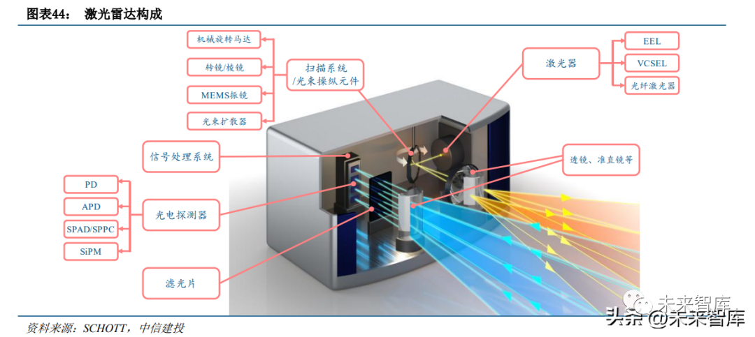 3)聚焦透鏡:將返回光線聚焦到探測器平面上,在接收端基本是必備的。4)窄帶濾光片:窄帶濾光片在特定的波段允許光信號通過,用在接收端以降低其他波段光線的干擾。5)分光鏡:分光鏡與激光雷達光路方案存在一定的關聯,主要在共軸掃描的激光雷達中分隔激光發射光線 和探測光線。大多數 Flash 激光雷達都采用了非同軸光路的設計思路,不再需要分光鏡。國內光學元件供應商眾多,可提供一體化解決方案且成本管控優秀的企業有望獲得競爭優勢。國內具備光 學元件供應能力的上游企業較多,已有多家公司表示已與激光雷達廠商建立合作關系或已經開始供貨,產品包 括透鏡、視窗等。國內也有部分公司向滿足激光雷達廠商定制化需求方面發展,例如炬光科技為智能駕駛激光 雷達發射模組或系統專門設計透鏡、光束擴散器等。由于常規件用量多,技術壁壘相對較低,預計量產能力強 且可提供一體化解決方案的平臺型企業有望獲得競爭優勢。同時,若未來行業競爭加劇,曾在消費電子市場競 爭中建立良好成本管控能力的企業有望獲得競爭優勢。