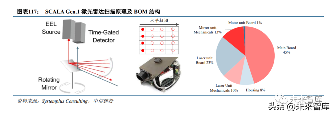 掃描轉鏡/棱鏡定制程度高,BOM 占比隨結構復雜度提升。當前轉鏡激光雷達內部有各種不同的設計方案, 從法雷奧 SCALA Gen.1、圖達通 Falcon 和 Livox Horizon 三大轉鏡式激光雷達的設計來看,越復雜的轉鏡/棱鏡 設計,對應越強大的光束操縱功能,雖然掃描系統 BOM 占比隨之提升,但激光收發的復雜度也有所降低(最 直觀的表現是可用較少的收發模組實現高線束掃描),這在一定程度上反映了激光雷達收發系統與掃描系統的 強關聯性。同時,掃描系統復雜度與 BOM 結構的變化關系,可以為其他轉鏡式激光雷達的成本結構分析提供 借鑒。1)法雷奧 SCALA Gen.1 采用一維轉鏡,本質上是一面反射鏡在電機的帶動下調整光線的水平掃描角度, 轉鏡本身只有一維掃描能力,而豎直方向的掃描角度則由激光源的裝配決定。SCALA Gen.1 內部有 4 顆分立的 EEL 激光源,因此為 4 線束掃描。這種轉鏡掃描方案設計簡單,工程上容易實現,轉鏡模組的 BOM 占比為 13%, 但若想升級高線束掃描需要較多的激光源。禾賽科技的 AT128 也是采用一維轉鏡的掃描結構,但用 VCSEL 陣 列解決了較多分立 EEL 激光源存在的高成本、大體積問題。