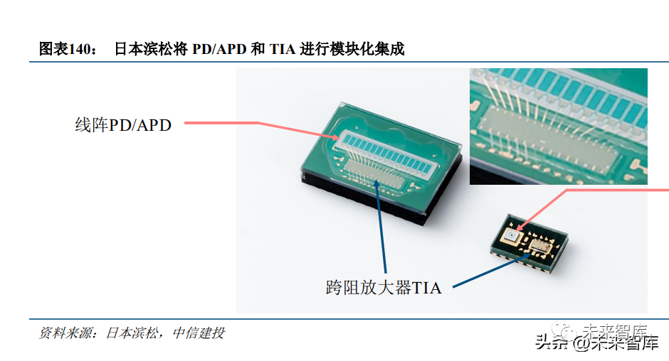 探測器集成前端處理電路將成為趨勢。日本濱松和索尼推出了不同形式的集成方案,我們概括為模塊化集 成和芯片級集成兩類。芯片級集成在縮小探測器體積和降低外圍電路復雜度體現出巨大潛力,有望成為未來的 發展趨勢,并構建探測器廠商的技術壁壘。1)模塊化集成:日本濱松將 PD/APD 和 TIA(跨阻放大器)集成到一起,從外觀結構上看,PD/APD 與 TIA 是通過引線封裝在同一塊 PCB 板上形成一個模塊。這種模塊化設計相比獨立探測器加外圍電路的傳統方式簡化 了下游客戶的電路設計難度,而濱松出于對自身探測器性能的理解,匹配適應的 TIA,相比下游客戶的設計有 望獲得更低的系統噪聲。