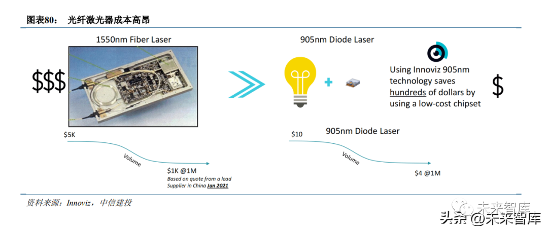 1550nm 光纖激光器提高功率解決衰減問題,但面臨高功耗、低能量轉換效率的問題。基于前文的分析, 由于 1550nm 有高人眼安全性,光纖激光器能以提高功率來解決衰減問題,并獲得超過 905nm 的探測距離。例 如圖達通 1550nm 激光雷達的最遠探測距離達到 500m(905nm 典型值為 200m-300m),10%反射率條件下探測 距離達到 250m(905nm 典型值為 150m-200m)。但這也產生更高功耗的代價。905nm 激光雷達的典型功耗在 20W 左右,而 1550nm 的典型功耗則在 30W 以上。905nm 半導體激光器相對光纖激光器少了光纖耦合和放大的 過程,能量轉化效率更高。1550nm 光纖激光器方案的系統成本仍較高。1550nm 光纖激光器系統成本較高主要來自激光器和探測器兩 方面,1)激光器:根據 Innoviz 上市路演報告,1550nm 光纖激光器單位價格達到 5000 美元,援引某中國供應 商的數據顯示百萬臺供貨量時單位價格仍達 1000 美元;而 905nm 激光二極管的單位價格約為 10 美元,百萬支 供應量時單位價格為 4 美元。2)探測器:因為材料的光敏性不同,1550nm 探測器需采用 InGaAs 制造,成本相 比 Si 基上升幅度大。目前 1550nm 激光雷達主要代表廠商為 Luminar 和圖達通,對應的車型蔚來 ET7、沃爾沃 EX90 均屬于中高端車型。