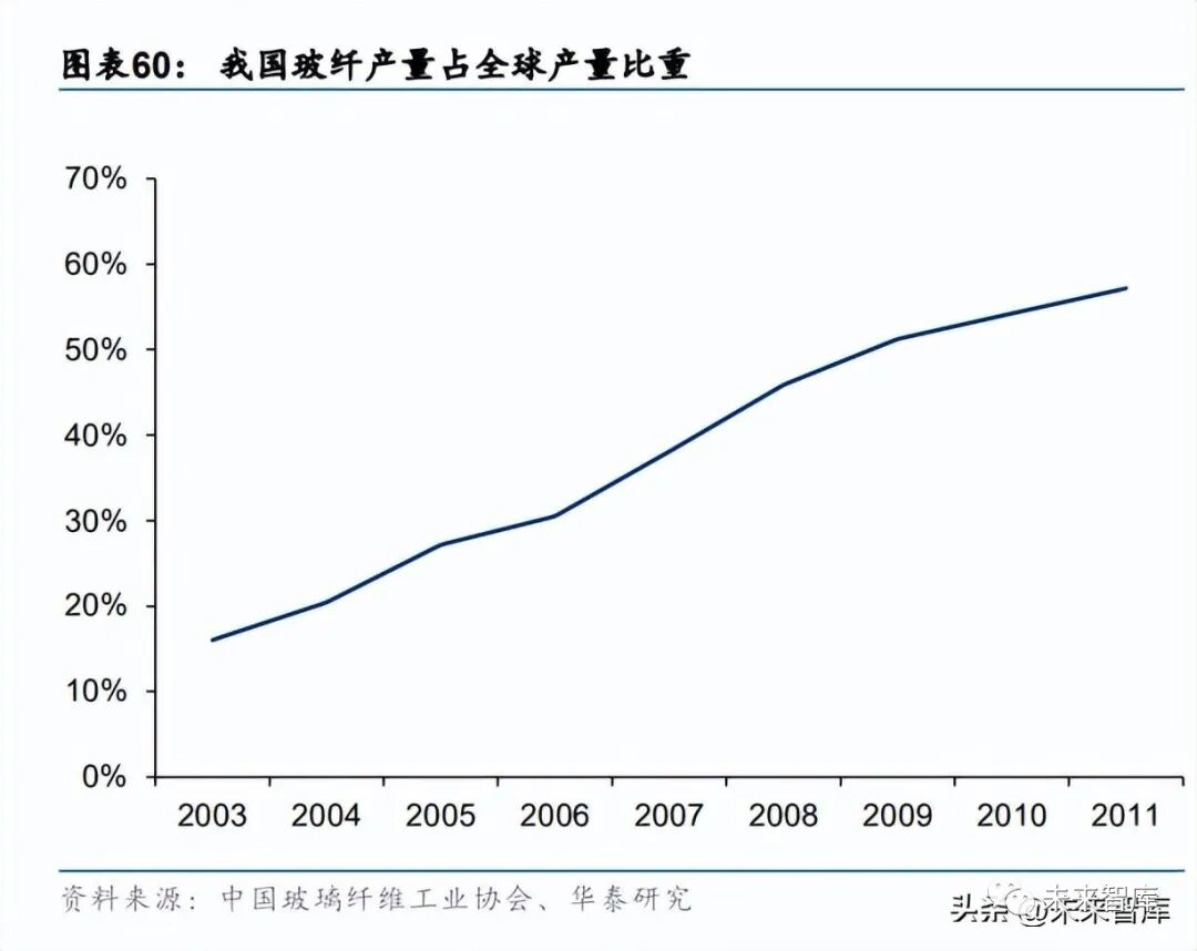 1990 年隨著國內首條無堿玻璃纖維池窯拉絲生產線投產,開啟了玻纖行業第一代技術革新。我國玻纖行業在發展初期主要通過坩堝生產法進行生產,該法需經二次熔化,不僅造成了 能源的二次浪費,而且單機產量低,生產成本高,90 年我國玻纖行業首條全套技術裝備從 日本引進的無堿玻璃纖維池窯拉絲生產線在珠海建成投產,開啟了玻纖行業第一代技術革 新,與坩堝拉絲法相比,池窯拉絲法具有工序簡化,能耗降低、鉑銠合金占用量少,生產 綜合成本低及能滿足多品種需要等一系列優勢,帶來行業整體生產成本的顯著下降。進入 21 世紀,隨著中國對大型池窯拉絲生產線的設計和建設技術的掌握,中國具備了池窯 拉絲生產全過程的裝備和耐火材料的配套供貨能力,新一輪的大型池窯建設高潮開啟。在 “十五”期間,我國玻纖產量的復合增速高達 37%,“十一五”期間復合增速達 22%,我 國玻纖產量增長主要來自無堿玻璃纖維池窯拉絲生產線的投產,期間巨石陸續建成 5 條近 60 萬噸的粗紗產能,引領全球玻纖工業,泰山玻纖,重慶國際產能亦快速擴張,截至 11 年底,我國玻纖產量占世界產量的比重達 57%,生產效率和產品的質量得到顯著提高,中 國玻纖龍頭的企業競爭力迅速提升。