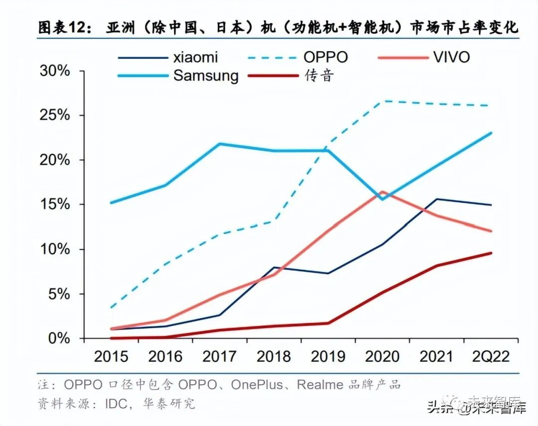 過去十年里,科技行業見證了 3G/4G/5G 通訊的升級、手機功能機向智能機的過渡、移動 互聯網的崛起等時代大機會。以華為、小米、VIVO、OPPO 為代表的中國手機品牌或以創 新產品、或以極致性價比,主動走出本土市場,相繼在東南亞、非洲、西歐、中東歐和拉 美市場站穩腳跟,占領新興市場,實現了從渠道,商標,再到品牌的出海,顛覆傳統市場 格局,正面挑戰全球手機霸主地位,開創了一個全新的時代。在 2Q22,榮耀、小米、OPPO、 VIVO、傳音等中國品牌占全球智能手機出貨量比重達到 52.4%,國產品牌也具有了更強的 海外話語權。
