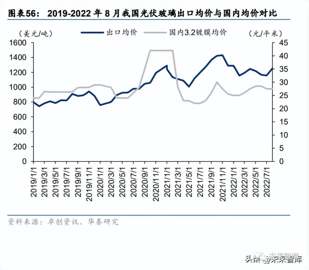 據卓創資訊,2019-2021 年我國光伏玻璃出口量穩定在 200 萬噸左右,增速不快的原因主 要是國內光伏裝機需求旺盛(增速高于全球整體增速),且由于“531 新政”后產能投放進度 較緩導致 2019-2021 年初國內光伏玻璃出現一定的供給缺口,因此光伏玻璃產量優先供給 國內組件廠商。從占比上看,隨著我國光伏玻璃產量的持續增長,光伏玻璃出口量在國內 總產量中的占比自 2016 年起持續下降,2022 年前 8 月出口量占比為 15.1%。從出口均價 上看,由于產品結構及匯率的不同,無法直接與國內價格進行換算對比,但兩者的變化趨 勢基本一致。而在進口量方面,由于 90%以上的光伏玻璃產能均位于國內,因此每年我國 光伏玻璃進口數量較少,最高的 2021 年也僅有 10.6 萬噸進口,其余年份則在 2 萬噸左右。