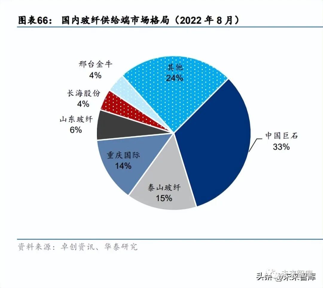 生產線投資強度高,生產較為剛性,供給端已形成寡頭格局。玻纖行業資產屬性較重,據 中國玻纖工業協會,新建 1 萬噸產能投資強度通常約 1 億元(其中高端產品生產線單位投 資強度更高),且玻纖生產線開窯后,需要連續生產 8-10 年,中途難以降低負荷調節產量 (因非正常停窯產生顯著額外成本),因而玻纖供給較為剛性。據中國纖維復材網,2021 年中國巨石在國內與全球的產能占比分別為 36%和 24%,由此可推算出目前國內玻纖產能 約占全球產能的 2/3,與產量占比接近。據國際復材(未上市)招股書,2020 年中國巨石、美國 OC、日本 NEG、泰山玻纖、重慶 國際、美國 JM、山東玻纖合計占全球玻纖總產能的 72%;而據中國纖維復材網,2021 年 五強玻纖企業產能合計便可占到全球玻纖總產能的 71%,行業集中度進一步提升。從國內 市場看,據卓創資訊,截至 2022 年 8 月末,中國巨石、泰山玻纖、重慶國際國內在產產能 分別為 220、99、91 萬噸,CR3 達 61%;山東玻纖、長海股份、邢臺金牛(未上市)在產 產能分別為 43、30、27 萬噸,CR6 達 75.9%。全球及中國國內,玻纖供給端寡頭壟斷格 局已基本形成。