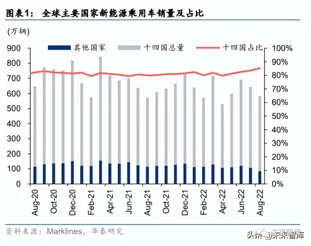全球主要新能源車市場集中在中國、美國、日本、韓國、印度、巴西、加拿大、以及歐洲 七國(英法德意、挪威、芬蘭、意大利),據 Marklines,7M22 全球 14 個主要國家新能源 乘用車銷量占全球新能源乘用車總銷量 85%左右,其中,中國地區銷量占比達 45%,是全 球新能源車第一大國。“雙碳“背景下,我國的新能源車發展主要受到政策快速推動影響,在補貼及購置稅減免等政 策扶持下,憑借低碳環保等優勢,替代傳統燃油車快速成長,7M22 整體新能源車滲透率達 到 24.5%。同時我國在核心鋰電池和基礎充電設施等方面積累了領先優勢。一方面,鋰電 池技術創新不斷突破,我國動力電池裝車量快速提升,1-7M22 占全球總裝車量比例達到 54%。另一方面,我國充電基礎設施也在不斷完善,7M22 我國公共充電樁保有量達 157.5 萬臺,環比增加 4.7 萬臺,同比增長 65.7%。目前我國新能源車市場已有超過 100 個品牌,日趨激烈的競爭在促進我國新能源車技術不 斷進步的同時,也讓車企將目光放到了全球其它地區。各大新能源車企開始制定其出海戰 略,我們看到蔚來、小鵬、廣汽、比亞迪等代表企業正在率先行動,推動我國新能源車出 口量快速增長。2022 年 1-8 月我國新能源車出口量達 34 萬輛,同比增長 97.4%。