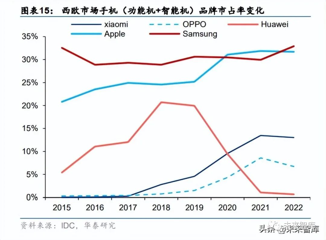 小米:同時開拓零售與運營商渠道。17 年小米進駐歐洲首站西班牙市場,與亞馬遜、家樂 福、MediaMarkt 和 Phone House 等歐洲知名商家合作來提供線上和線下的零售渠道,西 班牙也成為了小米最大的歐洲市場。18 年為了打通運營商渠道,小米通過和香港長江和記 集團旗下的 3G Group、歐洲零售巨頭 A.S. Watson 以及德國電器零售商 MediaMarkt 等陸 續合作,產品覆蓋奧地利、愛爾蘭、丹麥、意大利、英國等市場,實現西歐市場的全面覆 蓋。
