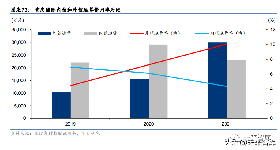 外銷方式多樣化,國際航線運力緊張導致運輸費用率持續上漲。據國際復材招股說明書, 其產品存在 FOB、CIF、CFR 等多種外銷模式,不同模式之間的區別主要在收入確認方式、 合同價格、運費及保險費承擔主體等方面。2019-2021 年,重慶國際外銷和內銷的運輸費 用率分別為 4.4%/7.3%/10.1%和 6.9%/6.1%/4.3%,外銷運輸費用率持續上漲,主要系國際 航線運力緊張,出口海運價格持續上漲。