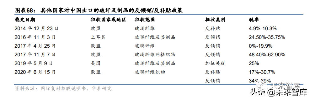 與光伏玻璃類似,玻纖及其制品同樣受到部分國家的反傾銷政策影響,其中美國自 2019 年 5 月 10 日起對從中國進口的玻璃纖維加征 25%的關稅,且 2022 年美國公布的第一批關稅 豁免清單中并未包括玻纖;歐盟對玻璃纖維、玻璃纖維織物、玻璃纖維網格織物均征收反 傾銷稅,但稅率略低于光伏玻璃(最高可達 75.40%);除此之外,土耳其也對從中國進口 的玻璃纖維征收反傾銷稅,稅率為 24.50%-35.75%。但與光伏玻璃不同的是,目前我國玻 纖在海外的基地同樣受到部分反傾銷和反補貼的影響,如歐盟對從埃及(中國巨石)進口 的玻纖紗征收 20%的反傾銷稅和 13.1%的反補貼稅,歐盟和印度也曾對從巴林(重慶國際) 進口的玻纖紗進行過反傾銷和反補貼調查(已撤案)。
