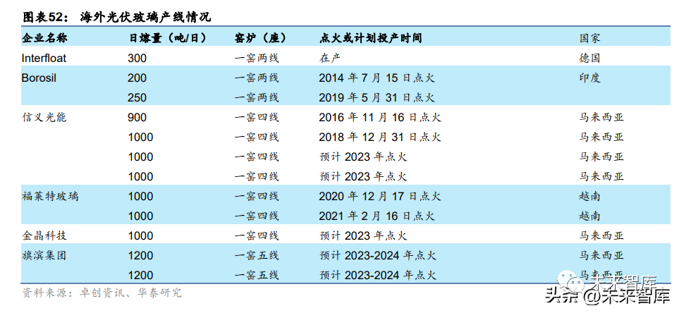 國內指標壓力下未來或有更多國內廠商選擇在海外建廠。目前國內光伏玻璃廠商僅福萊特 和信義光能在海外擁有生產線,其中福萊特在越南擁有 2 條 1000t/d 的生產線 在產,信義光能在馬來西亞有 1 條 900t/d 和 1 條 1000t/d 的生產線在產,并有 2 條 1000t/d 的生產線在建,計劃于 2023 年陸續投產。除了福萊特和信義光能,海外公司 Interfloat 和 Borosil 分別于德國和印度有 300t/d 和 450t/d 的光伏玻璃產能。其他國內廠商中,2018 年金晶科技公告于馬來西亞設立全資子公司,擬投資建設 1 條 500t/d 薄膜光伏組件背板玻璃產線和 1 條 500t/d 的 TCO 前板玻璃產線。目前該項目的背板玻璃 產線已于 2022 年 1 月成功點火,TCO 前板玻璃產線正在為世界最大的薄膜光伏組件廠商 First Solar(FSLR US)送樣測試,有望于 2022 年底至 2023 年開始批量供應。同時,2021 年金晶科技在其三季報中表示,公司擬于馬來西亞新建 1 條 1000t/d 的光伏玻璃產線,該產 線有望于 2023 年投產。2022 年 3 月,旗濱集團公告擬投資 31.2 億元于馬來西亞建設 2 條 1200t/d 的光伏玻璃產線,項目建設周期為 16 個月,考慮前期準備等時間,則有望于 2023-2024 年投產,屆時國內廠商在海外的光伏玻璃產能有望達 9300t/d。隨著國內產能指 標趨于緊張且海外需求持續旺盛,未來或有更多國內廠商考慮在海外布局光伏玻璃產線。