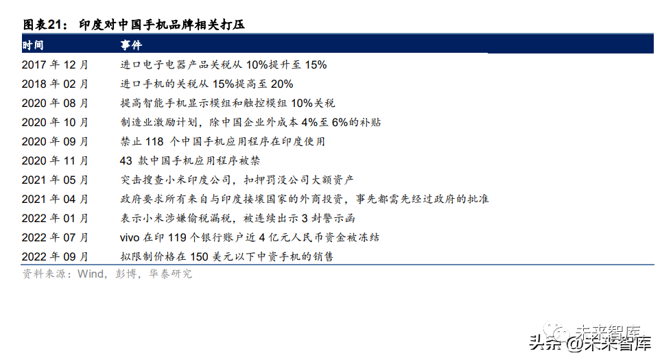 2018 年以來地緣政治開始對手機品牌出海帶來挑戰。一方面,不管是對華為的限制,還是 以印度為代表的地方政府對中國手機品牌的持續打壓,都在手機品牌廠商已經建立起優勢 的部分海外市場帶來挑戰;另一方面,美國、加拿大等市場在通信運營商壟斷、專利限制 以及貿易保護的限制下,中國手機品牌一直較難進入此類市場。貿易保護主義打壓中國品牌出海。面對國產品牌 Lyf 市占率一路下滑的現況,印度政府采取 一系列措施以打壓國外品牌維持本土利益,從 2020 年開始針對中國的小米、OPPO 以及 VIVO 等品牌出臺一系列針對性限制措施,小米印度公司巨額資產一度被扣押,VIVO、OPPO 則是由于稅務問題被幾次審查。2022 年 7 月 22 日,華為旗下的榮耀手機團隊,也傳出要 撤出印度的消息。